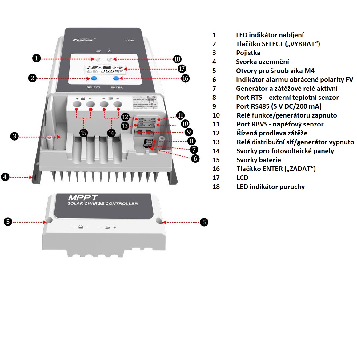 vč. kontrolních LED diod. Regulátor z řady Tracer AN je založený na