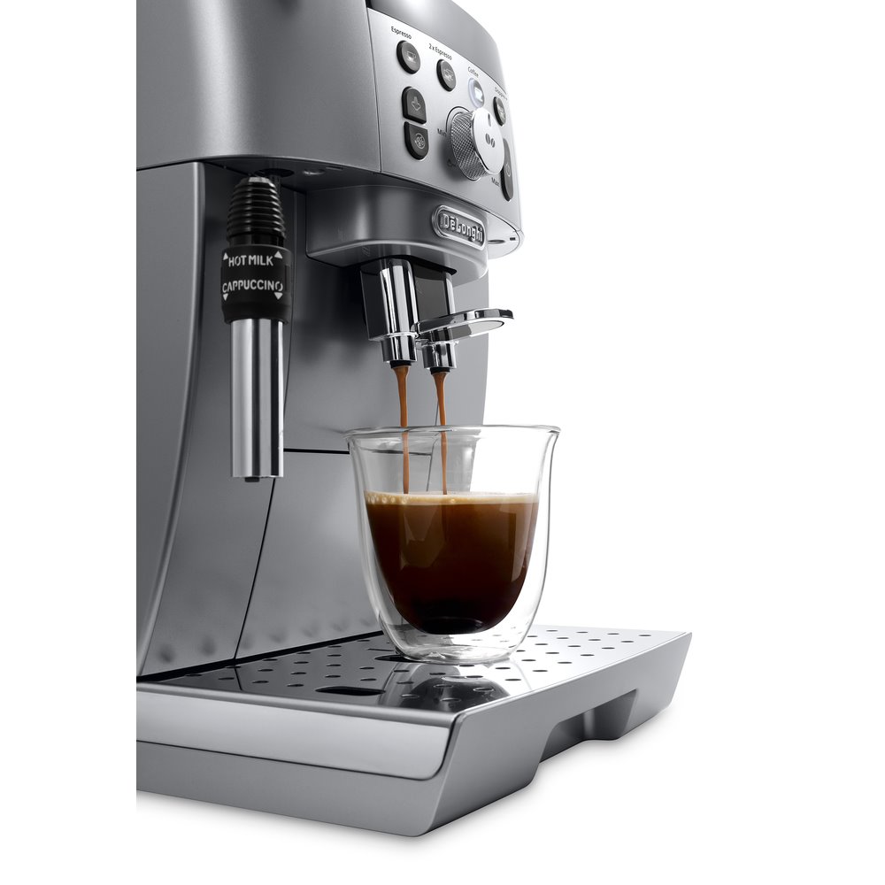 De'Longhi Magnifica Smart (ECAM 250.31 SB) je kompaktní plně automatický presovač s příkonem 1 450 W, který snoubí luxusní design, nadstandardní funkce a hlavně výbornou kvalitu a rozmanitost přípravy kávy – Cappuccino, Espresso, dvojité Espresso, Latté, Doppio, mléčné pěna a horká voda. Kávovar využívá profesionální čerpadlo s maximálním tlakem až 15 barů, díky němuž dosáhnete špičkových výsledků, nad kterými se pozastaví každý milovník kávy. Elektronický termostat na páru a kávu a patentovaný termoblok se postarají o ideální a konstantní teplotu, která je potřebná k přípravě poctivého espressa.