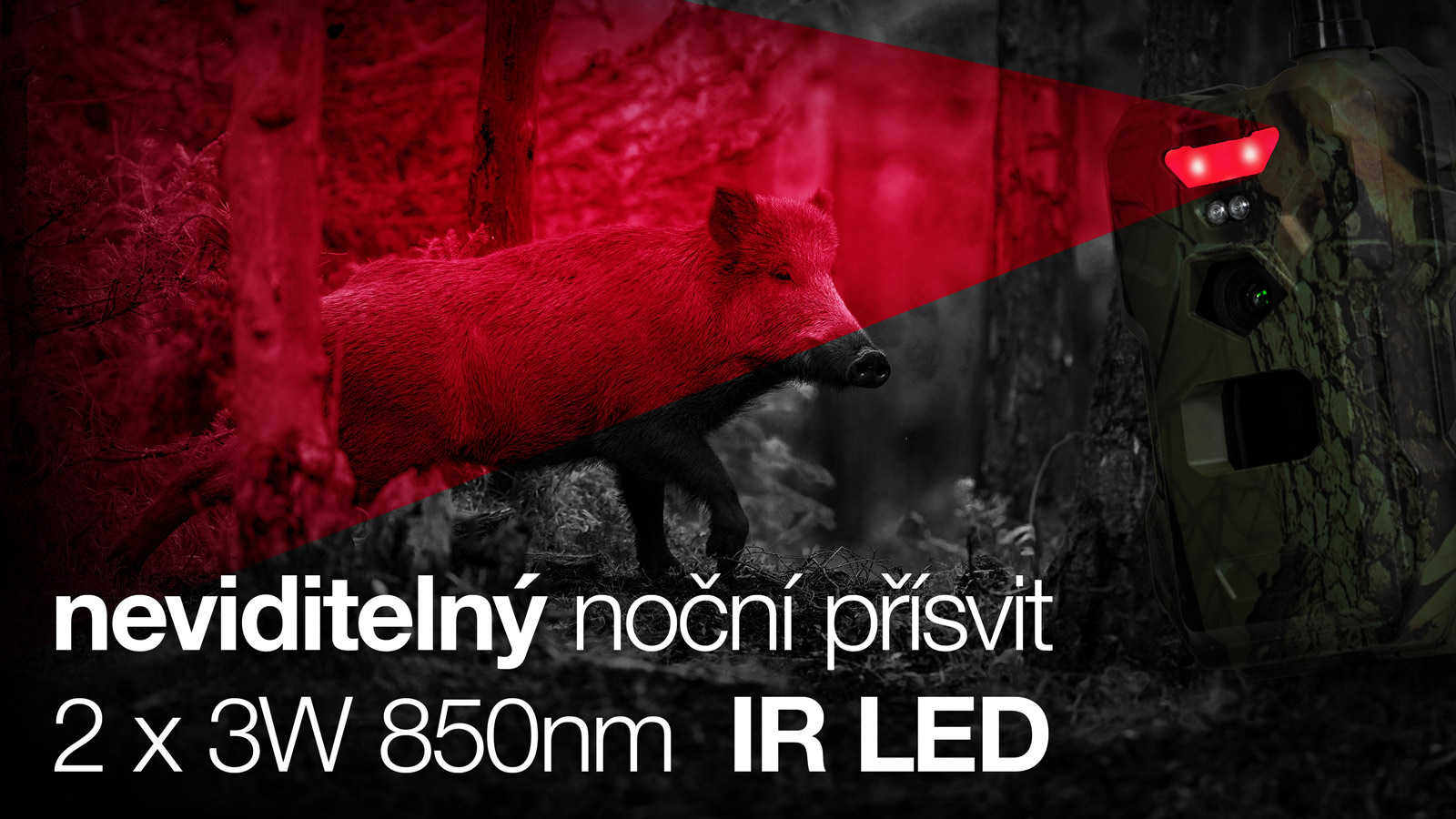 Infra noční přísvit je důležitá funkce každé fotopasti, díky850nm LEDdiodám lze zařízení použít nejenom pro sledování zvěře, ale i k