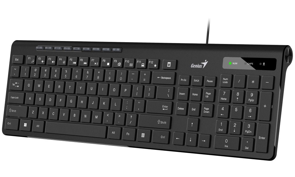 Klasická drátová klávesnice je navržena tak, aby uživateli poskytla maximální komfort při každodenní práci. Ergonomický sklon společně s klávesami typu chiclet umožňuje efektivní a pohodlné psaní. Připojení k počítači je realizováno skrze USB port.