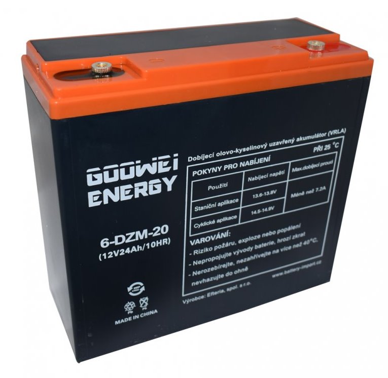 Záložní 12 V, 24 Ah olověný akumulátor v provedení VRLA (GEL) vhodný pro aplikace, kde dochází k častému a hlubokému vybíjení / cyklování, tedy hlavně pro pohony elektromotorů.