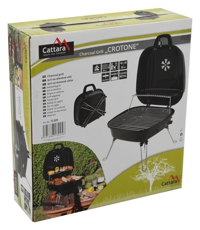 Na víku se nachází regulovatelná ventilace, která zajišťuje plynulý přísun vzduchu. Přizpůsobíte si ji podle vlastních potřeb. Konstrukce grilu Cattara se vyrábí z kvalitního smaltovaného ocelového plechu v černé barvě. Po sestavení je díky 4 kovovým nohám velmi stabilní. Gril snadno složíte, zajistíte ho páčkou a pomocí rukojeti ho lehce přemístíte.