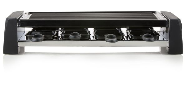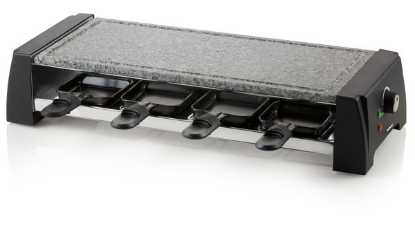 S příkonem 1 200 W velmi rychle přichystáte skvělé jídlo pro rodinu i přátele. Teplotu si nastavíte podle sebe pomocí otočného termostatu. Na dosažení požadované teploty vás upozorní praktická světelná signalizace. Součástí grilu je 8 grilovacích pánviček s nepřilnavou vrstvou, ve kterých připravíte sýry, zeleninu nebo vajíčka. V balení navíc najdete i 8 dřevěných špachtlí.