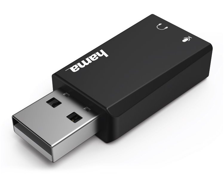 Externí zvuková karta pro připojení audio zařízení převádí digitální signál z USB rozhraní na standardní analogový audio signál.