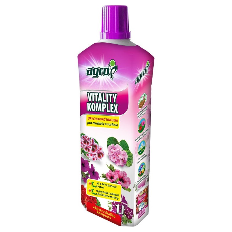 Jedinečný přípravek AGRO Vitality Komplex je ideální pro muškáty, surfinie, begonie, fuchsie, milion bells a celou řadu dalších druhů balkónových okrasných květin. Obzvláště přijde vhod pro oslabené rostliny, které jsou značně poškozené a zanedbané. Ošetřená květina totiž získá vyšší odolnost a obranyschopnost, jelikož přípravek urychlí regeneraci po krutých mrazech, přemokření či po extrémním suchu, zabrání v šíření infekce, tlumí vzdušné houby a působí repelentně proti všem nejčastějším škůdcům.