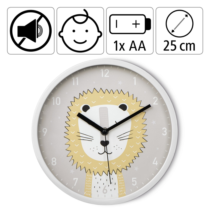 Nástěnné hodiny s milým lvem od značky Hama. Hodiny nabízí analogové zobrazení času, tichý chod bez hlasitého tikání a velký ciferník s arabskými číslicemi. Nechybí ani hodinová a minutová ručička.