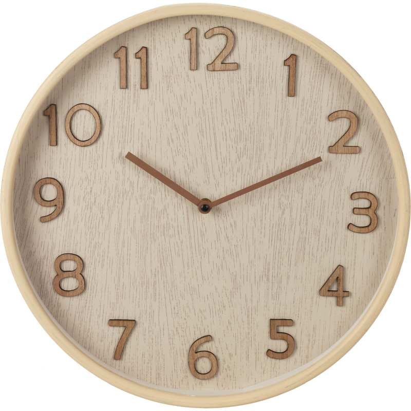 prostoru. Hodiny mají světlý ciferník s hnědými ručičkami a