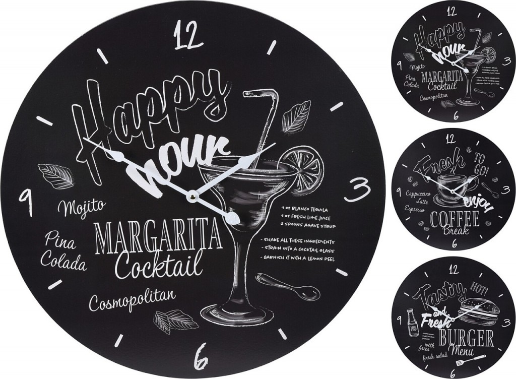 Netradiční designové hodiny s motivem koktejlů. Tělo hodin je vyrobené z dřevěné desky a ručičky jsou kovové. Jistě oceníte absolutně tichý chod, jelikož hodiny netikají. Napájení pouze na 1 tužkovou AA baterii (není součástí balení). Svým provedením se nejlépe nabízí umístění do baru, kuchyně, restaurace či bistra nebo do venkovní letní kuchyně.