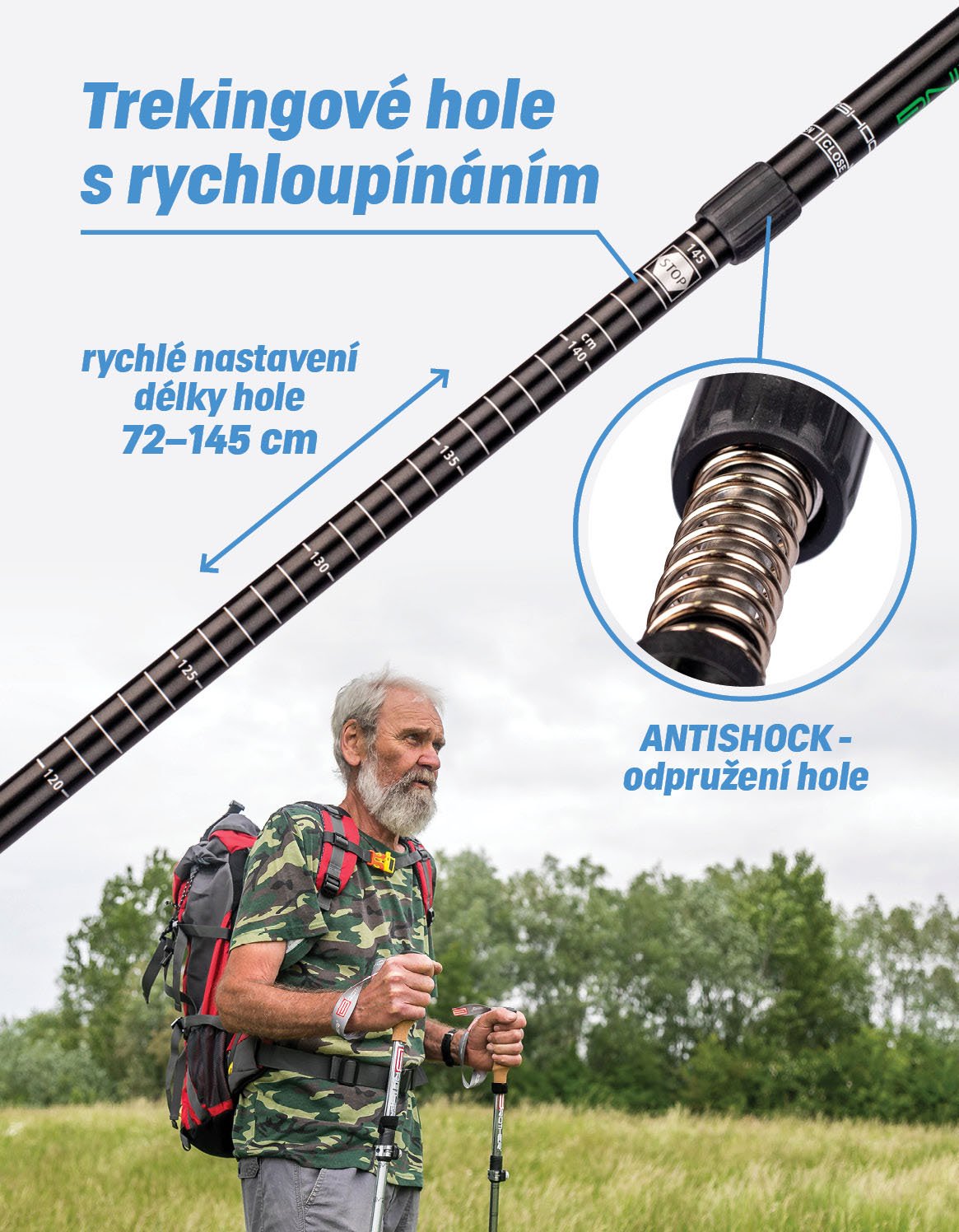 Chcete mít pevnější krok a větší radost z pohybu? Vyzkoušejte trekingové hole LTH138 značky Acra, které vám budou skvělou oporou i při náročnější turistice. Jsou odpružené systémem ANTISHOCK. Jejich teleskopické provedení vám umožní nastavit si délku v rozpětí od 72 do 145 cm. Jsou opravdu lehké. Jedna hole se skládá ze tří dílů a váží pouhých 295 g. V balení najdete také sadu vyměnitelných kroužků a gumové koncovky.