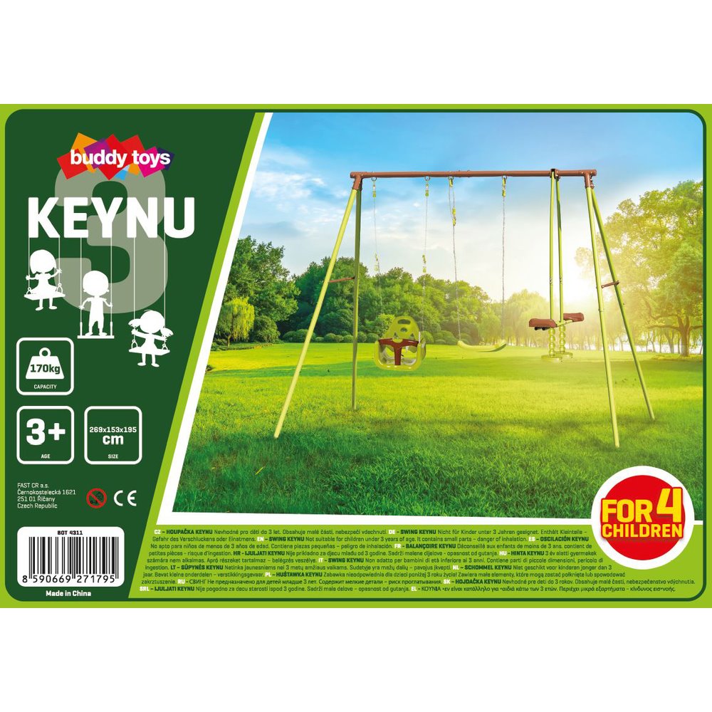 Set houpaček Keynu 3 značky Buddy Toys se skvěle hodí do školní zahrady nebo na hřiště. Houpačku ocení zejména početnější rodiny. Na houpačce si mohou hrát až 4 děti od 3 let. Nosnost je až 170 kg. Houpačky jsou ke konstrukci připevněny karabinami pro snadnější výměnu.
