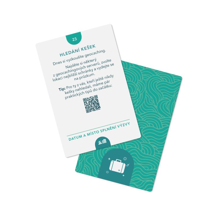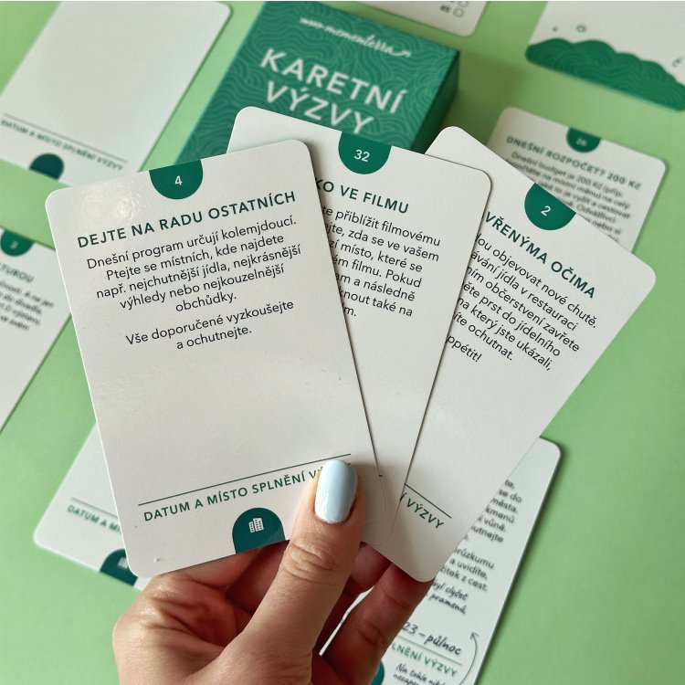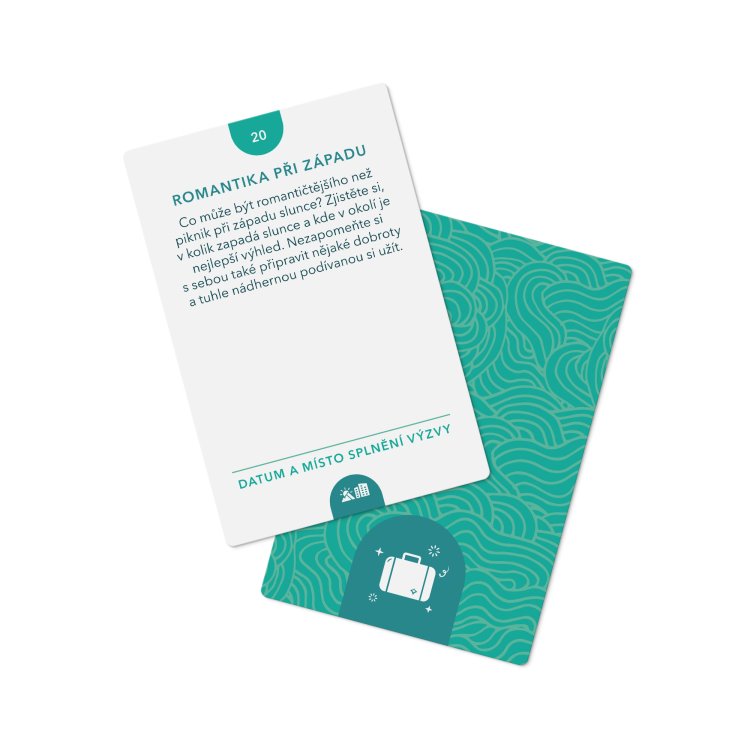 Na 5 prázdných karet si vymyslíte své vlastní výzvy. Napíšete si na ně úkol, který jste si vždy přáli vyzkoušet nebo který vás láká splnit. Součástí balení je také karta s otázkami. Po každém splnění výzvy si na některou z nich pokusíte odpovědět. Nebojte se, že byste na nějaký úkol zapomněli. Pomocí karty na odškrtávání hotových výzev vždy zjistíte, které máte hotové. Ke každému úkolu si navíc můžete připsat, kdy a kde jste ho splnili.