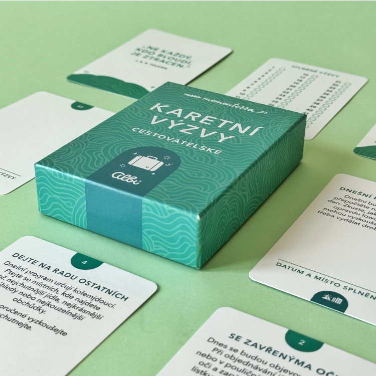 Cestovatelské karetní výzvy od Albi obsahují celkem 40 unikátních karet. Vezměte si je na výlety, procházky nebo klidně na dovolenou. Zpestříte si cestování, ať už vytáhnete náhodnou výzvu, vyberete si ji nebo je plníte popořadě. Karty se řadí do 3 kategorií – přírodní, městské a univerzální. Poznáte je podle symbolu na dolní části kartičky. Přečtete si úkol a pokusíte se ho společně se svou milovanou polovičkou, přáteli nebo rodinou splnit.