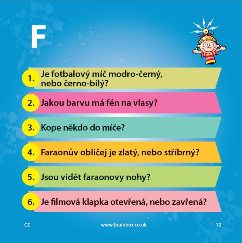 Tento přepracovaný BrainBox, snadný a založený na klasické abecedě, dává dětem náskok v získávání životně důležitých dovedností, jakými jsou rozpoznávání písmen a čtení. Zároveň pomáhá procvičovat a zlepšovat jejich pozorovací schopnosti a paměť. Tato skvělá hra, která byla vyvinuta ve spolupráci se zkušeným učitelem základní školy, je nyní úzce napojená na učební osnovy fonetiky tak, jak se vyučují na některých vybraných školách. Cílem hry je stát se tím, kdo během 10 minut získá nejvíce karet. Je potřeba pozorně prostudovat obrázek na kartě a poté správně odpovědět na položenou otázku.