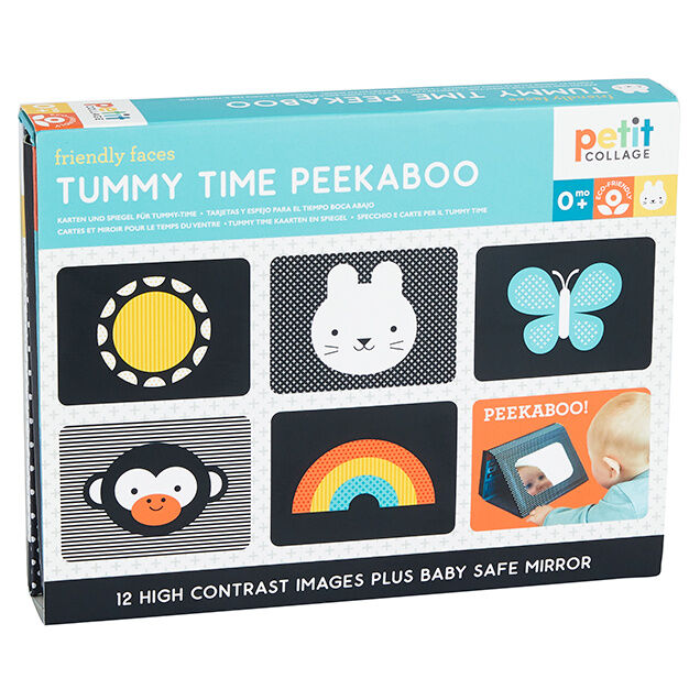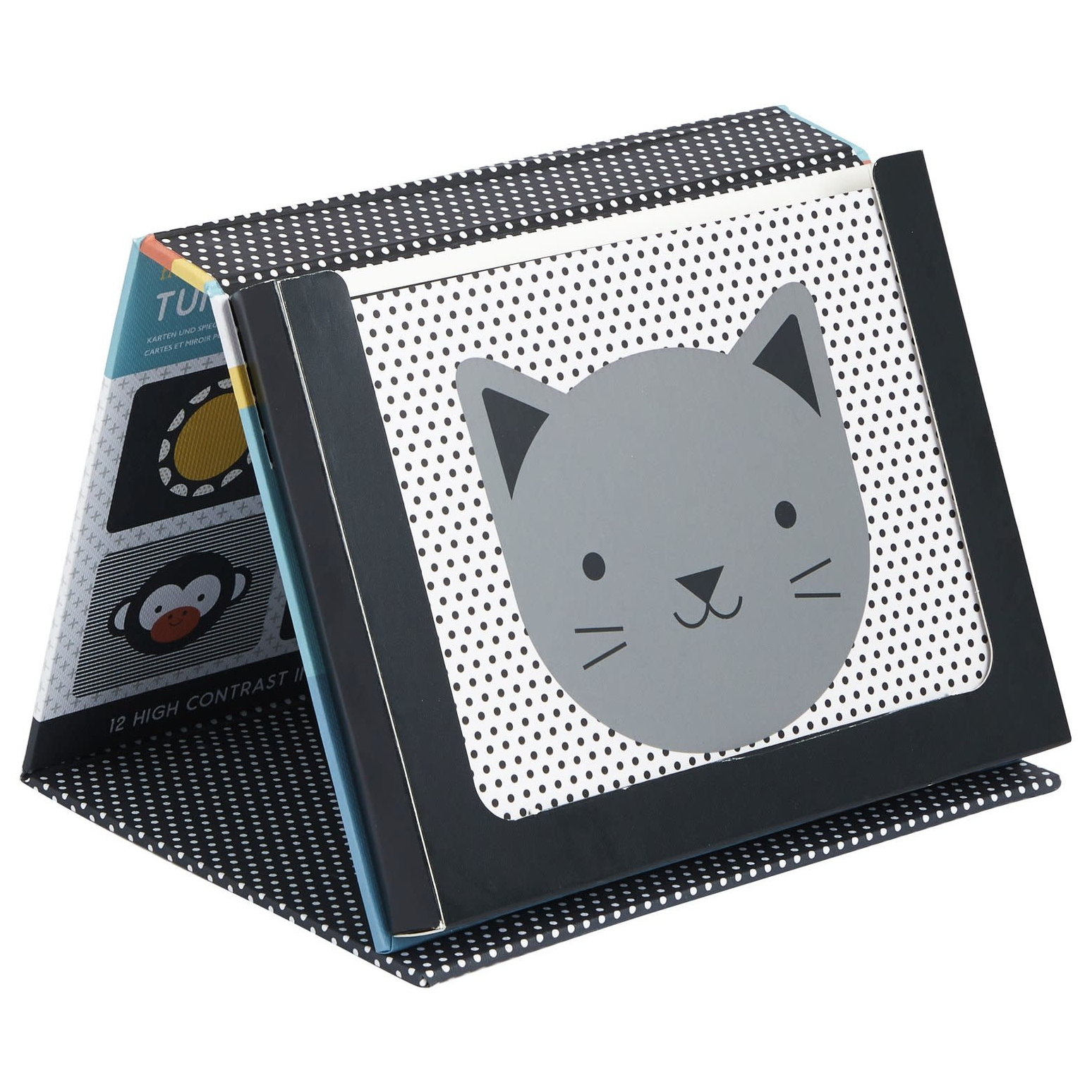 Juk nebo kuk? Střídejte hravé kontrastní ikony zvířat s pohledy do zrcátka, a zabavte tak svého malého zvědavce, když leží na bříšku. Přebal hry můžete složit do trojúhelníkové podstavy s kapsou pro obrázky a zrcátkem na druhé straně. Obrázky s roztomilými zvířecími tvářemi jsou kontrastní, poutají pozornost a rozvíjí zrak.