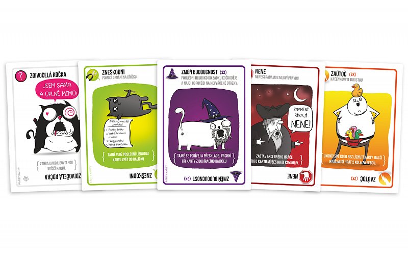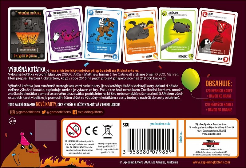 Hráči si dobírají karty, dokud si někdo nelízne výbušné koťátko, exploduje, umře a je vyřazen ze hry. Pokud ten hráč nemá kartu Zneškodni, která mu umožní zneškodnit koťátko pomocí laserového ukazovátka, podrbáním na bříšku nebo sendviče s šantou kočičí. Úkolem všech ostatních karet v balíčku je pomoci hráčům držet se výbušným koťátkům z cesty (nebo je nastrčit do cesty ostatním). Toto balení obsahuje nové karty, díky kterým si můžete zahrát až v deseti lidech. A ještě něco navíc! Abyste si nezaměnili své drinky, tak použijte super stylové rozlišovače na skleničky! No a aby toho nebylo málo, tak při otevření krabičky na vás čeká velice příjemná kočičí NeNemelodie, která vás rychle naladí na tu správnou atmosféru.