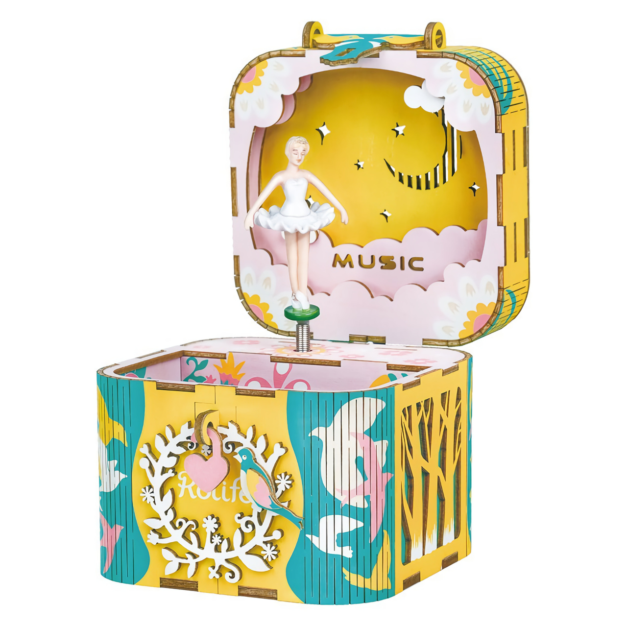 Detailní barevný model klasické šperkovnice. Skládačky hracích skříněk Robotime jsou nabízeny v mnoha podobách, přírodních i barevných, lišících se nápaditými pohyblivými detaily doprovázejícími zvuk. Nezaskočí vás svou náročností a po sestavení zkrášlí poličku.