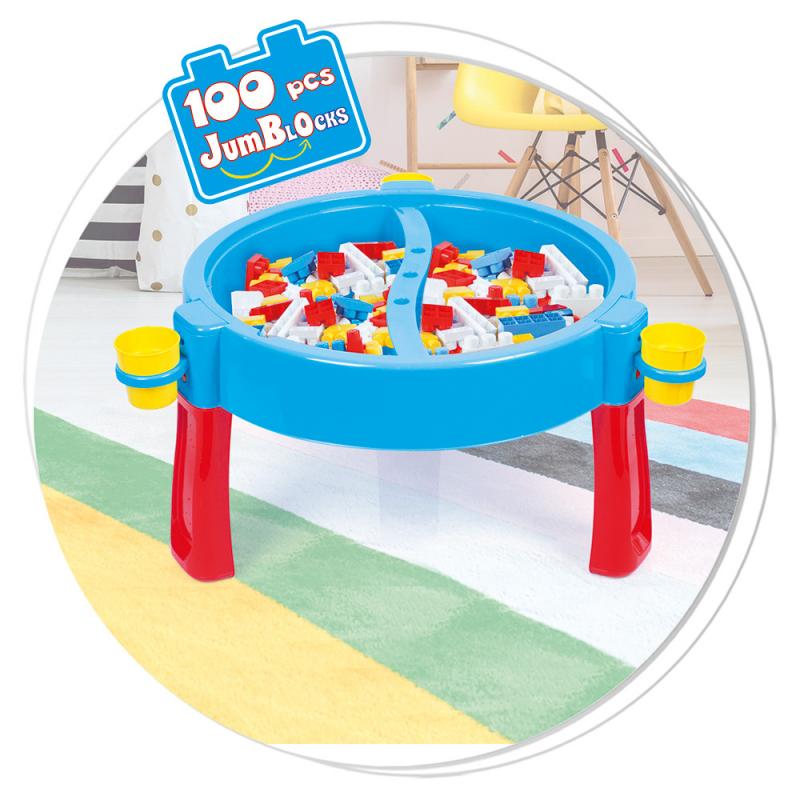 Hrací stolek Dolu 2v1 s velkými kostkami si vaše děti zamilují už od prvního použití, neboť s ním zažehnají nudu a užijí si s ním obří porci zábavy i ponaučení. Sundáním vrchní desky, která slouží ke psaní, kreslení i k dalším tvořivým aktivitám, vznikne hrací plocha pro stavbu hradů, domků či jiných budov z kostek. Pro budování pak mají malí stavitelé k dispozici 100 dílků stavebnice, ze kterých budou před očima vznikat divy světa. Do kelímků zavěšených na stolku lze vložit pastelky, nůžky nebo jiné psací, kreslířské či malířské potřeby.