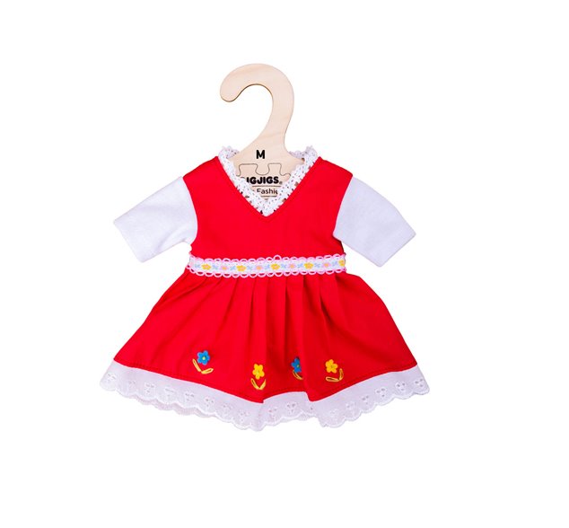 Tuto krásnou kolekci oblečení pro hadrové panenky Bigjigs Toys si jistě zamilujete. Červené květinové šaty můžete obléci na panenky o velikosti 34 cm. Součástí oblečení je také ramínko, které pohodlně zavěsíte na praktický věšák. S panenkami a jejich doplňky od značky Bigjigs si vaše dětičky užijí spoustu zábavy. Každý den mohou své panenky převléci do nového outfitu a vyrazit například do města nebo do školky.