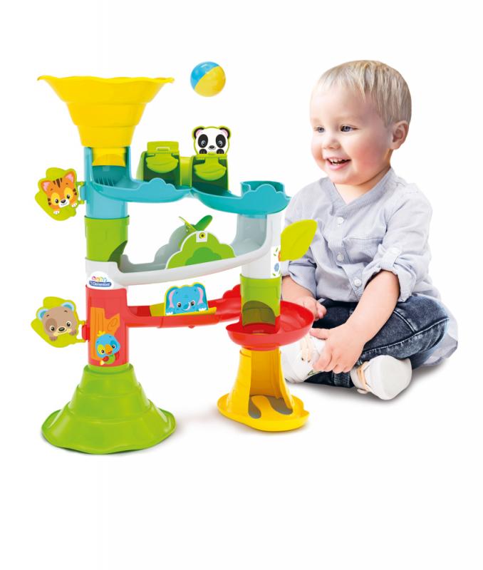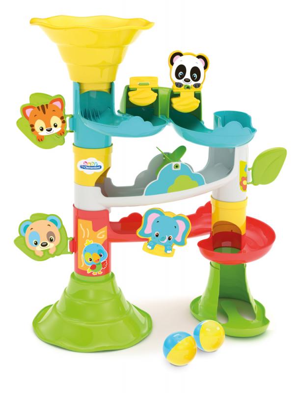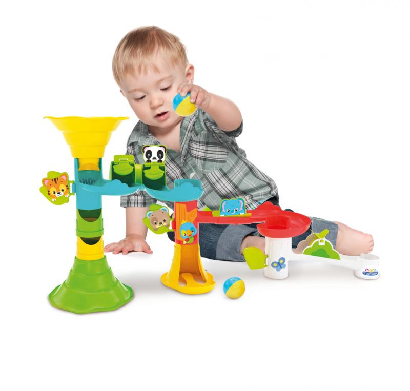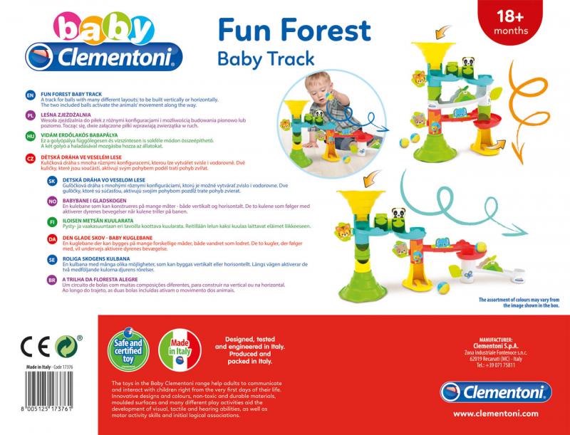 Zábavná Baby velká kuličková dráha se zvířátky pro batolata značky Clementoni. Dráhu lze seskládat více způsoby a lze tak vytvářet horizontální a vertikální trasy. Míček pohybující se po dráze míjí zvířátka, která vždy vtipně reagují. Hračka stimuluje rozvoj manuálních dovedností, rozpoznávaní vztahů mezi příčinou a následkem a vizuální vnímání. Dráha je vyrobená z pevného, barevného plastu a snadno se sestavuje. Sada obsahuje 2 kuličky a nálepky k ozdobení dráhy. Vyrobeno v Itálii.