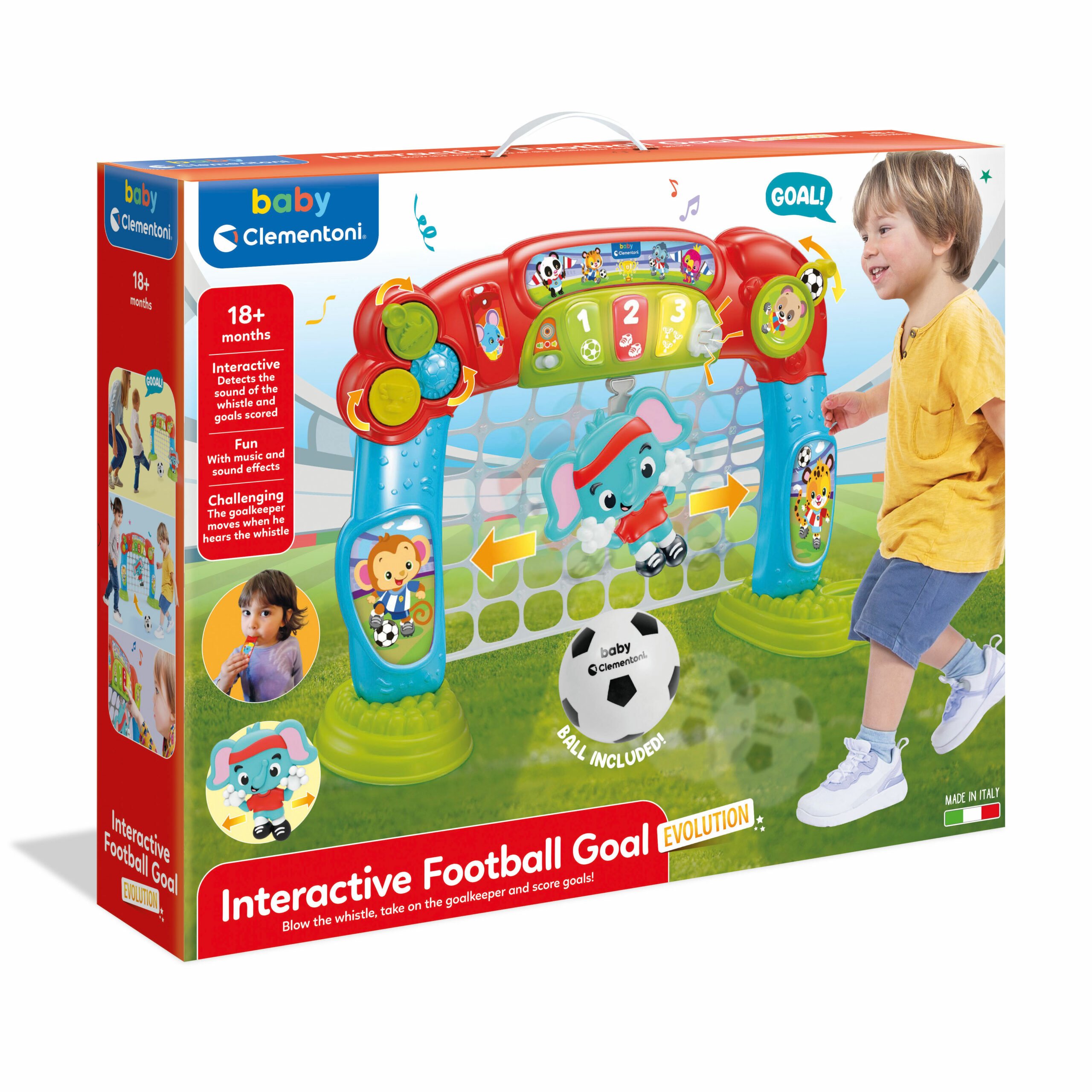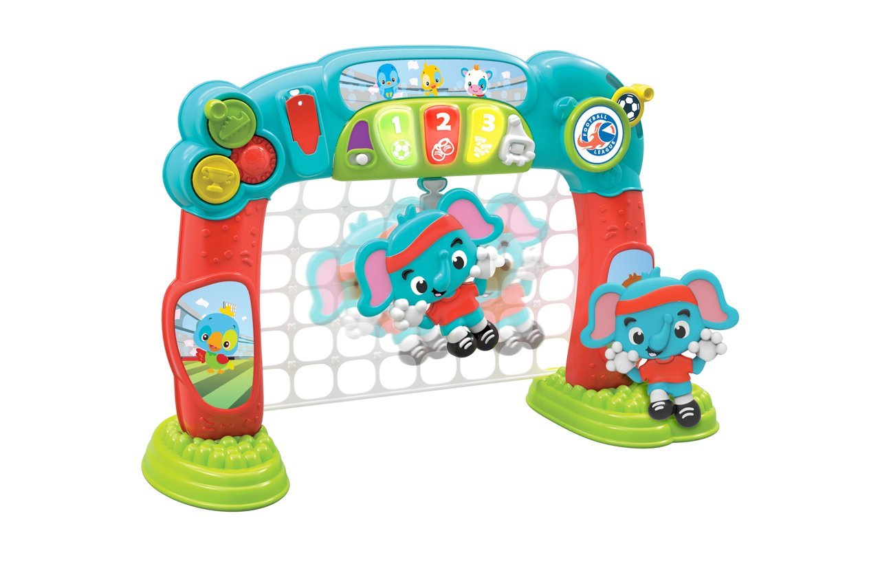 Hračka Clementoni Interactive Football Goal představuje parádní tréninkové centrum pro všechny začínající fotbalisty, neboť je vybavená pohybujícím se brankářem v podobě roztomilého slona, díky kterému si vaše ratolest nacvičí sílu i přesnost střelby. O napájení branky se poté starají 2 AAA baterie (nejsou součástí této dodávky, v balení jsou pouze imitace baterií pro demonstrativní účely), které umožňují pohyb brankáře a zajistí spolehlivý chod všech zvukových i vizuálních efektů.