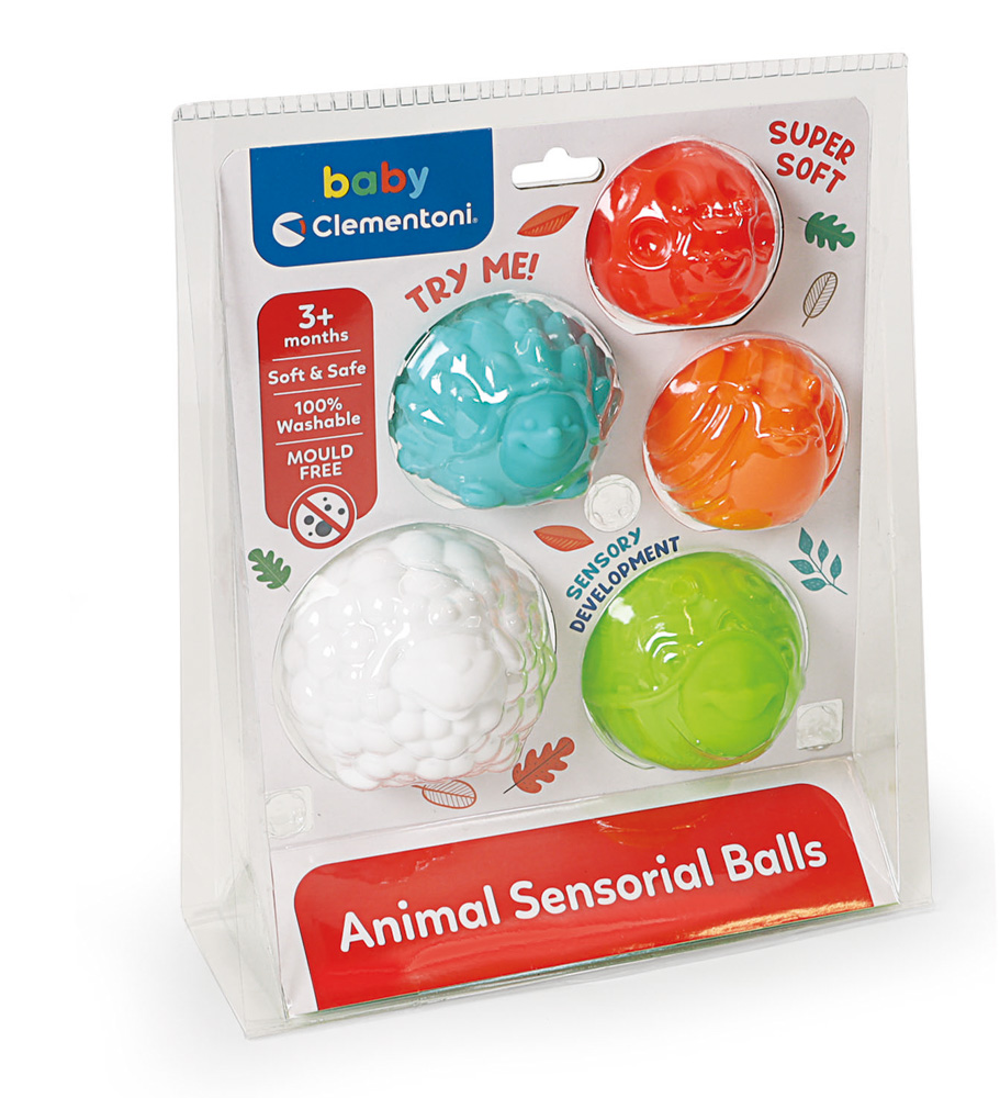 Sada Clementoni obsahuje celkem 5 senzorických míčků. Každý z nich má tvar zvířátka s jinou texturou. Hodí se pro děti od 3 měsíců. Hrají si s nimi a zkoumají je. Míčky se vyrábí z měkkých materiálů, které jsou hygienické a dají se snadno omýt. Navíc odolají plísním, proto jsou bezpečné. Součástí balení je míček v podobě ovečky, berušky, ježka, šneka a želvy. Během hraní si dítě rozvíjí obratnost a koordinaci pohybu. Zároveň si rozvíjí svou fantazii.