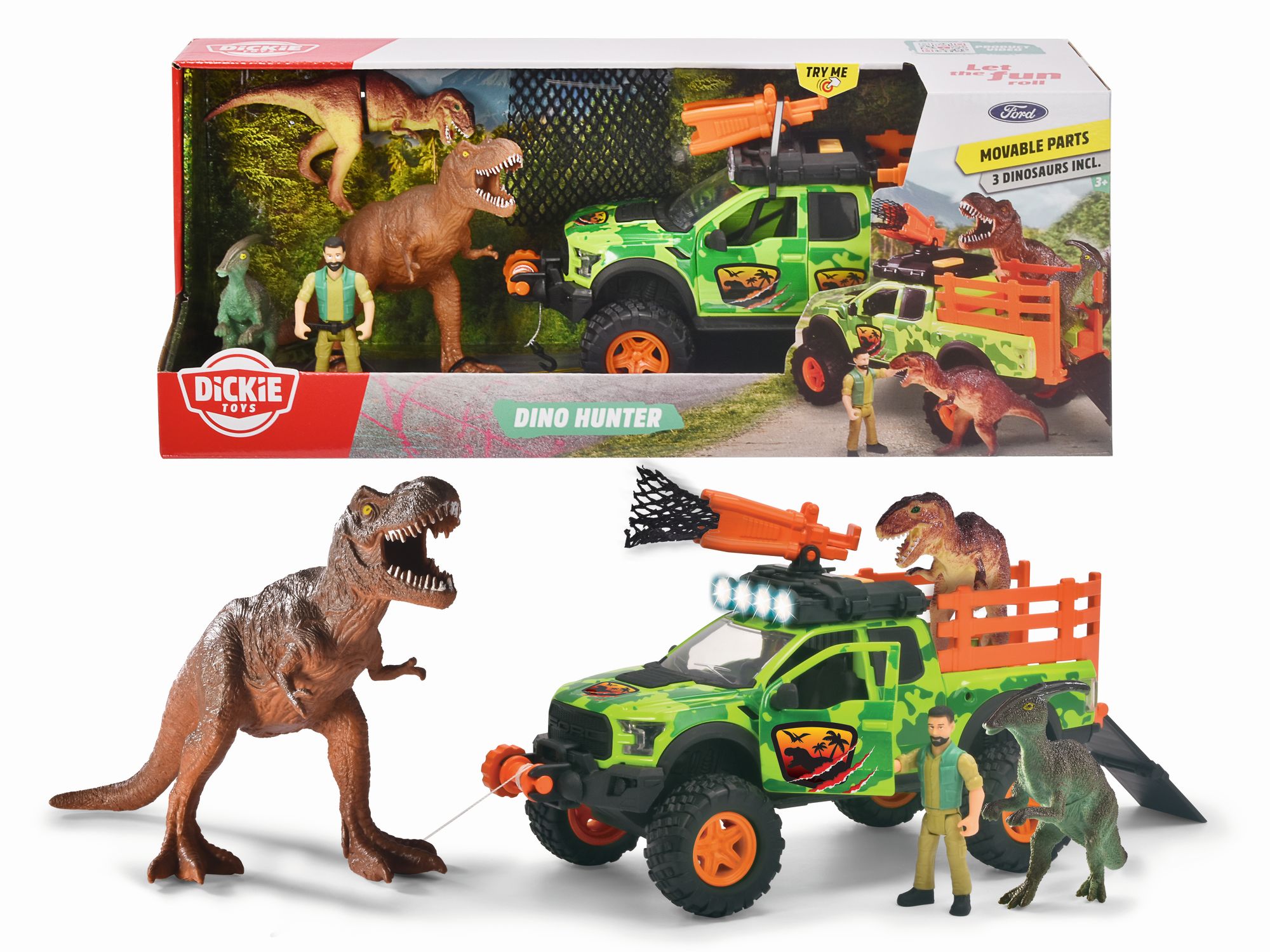 Zbožňuje vaše dítě dinosaury? S hračkou Dickie Dino Hunter si užije spoustu zábavy. Balení obsahuje figurku lovce, 3 dinosaury a terénní vůz Ford Raptor v maskovací barvě džungle. Gumové pneumatiky auta umožňují pohyb i po nerovném terénu. U Fordu může váš potomek dokonce tlačítkem zapnout světlo a zvuk. Hraní bude o něco zajímavější.