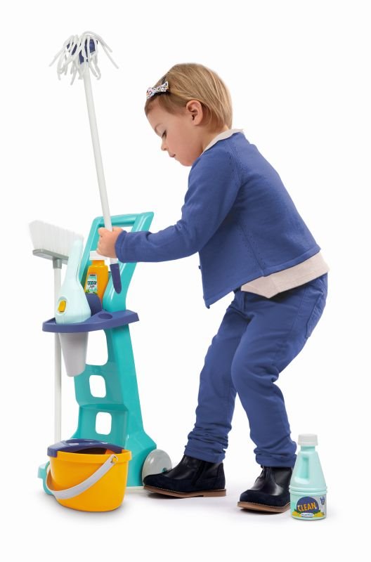 Úklidový vozík Ecoiffier má 2 pojízdná kolečka, je vyrobený z odolného plastu a rovněž je zhotovený bez ostrých hran pro vyšší bezpečnost při bezstarostných hrách. Plastové provedení rapidně snižuje hmotnost, proto je vozík dobře ovladatelný, díky čemuž vám může vaše dítko pomáhat naprosto kdekoliv. Hračce nechybí mnoho autentických prvků, jako je například kbelík, mop, smeták, ruční vysavač a další realistické úklidové potřeby, které zvýší uvěřitelnost všech herních scénářů.