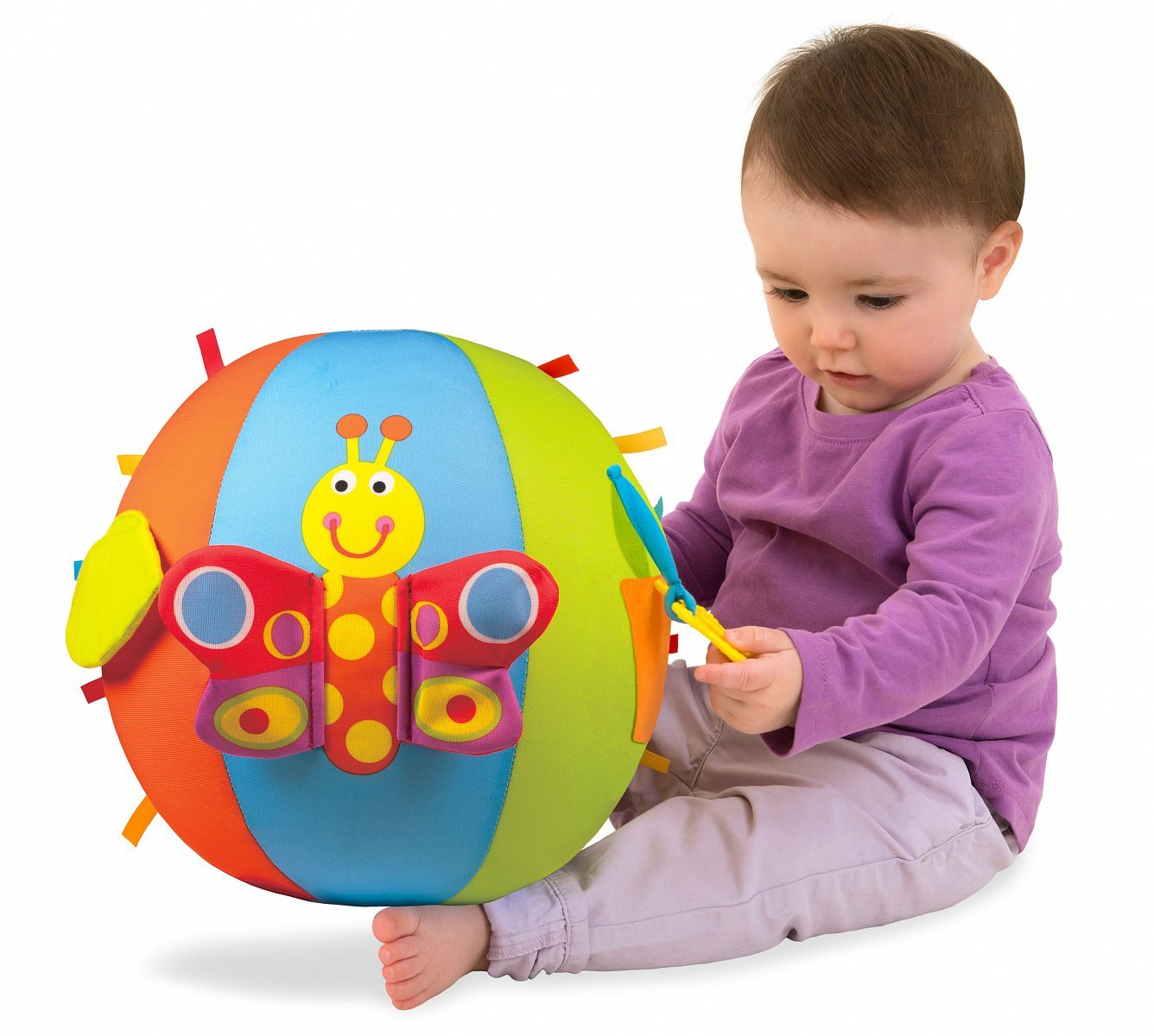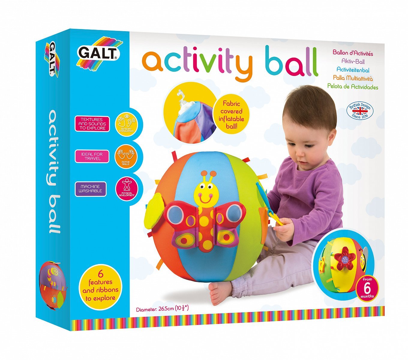 Velký nafukovací míč Galt Activity Ball potěší malé kojence ve věku od 6 měsíců, kdy nabízí hned 6 různých aktivit pro rozvoj smyslů a psychomotorických dovedností. Má potah z jemné látky, díky čemuž lze prát v pračce a je velice příjemný na dotek, takže je ideální pro dětské objímání a mazlení. Navíc je použitý materiál dostatečně lehký, takže vaše ratolest poprvé okusí míčové hry. Po obvodu míče se poté nacházejí pestrobarevné stuhy a další doplňky pro zábavné hraní všeho druhu, mezi které patří pískací motýlí křídlo, kousátko ve tvaru květiny, krásné okvětní lístky, včelka s lesklými křídly, chlupatá housenka a vykukovací (peep-bo) list.