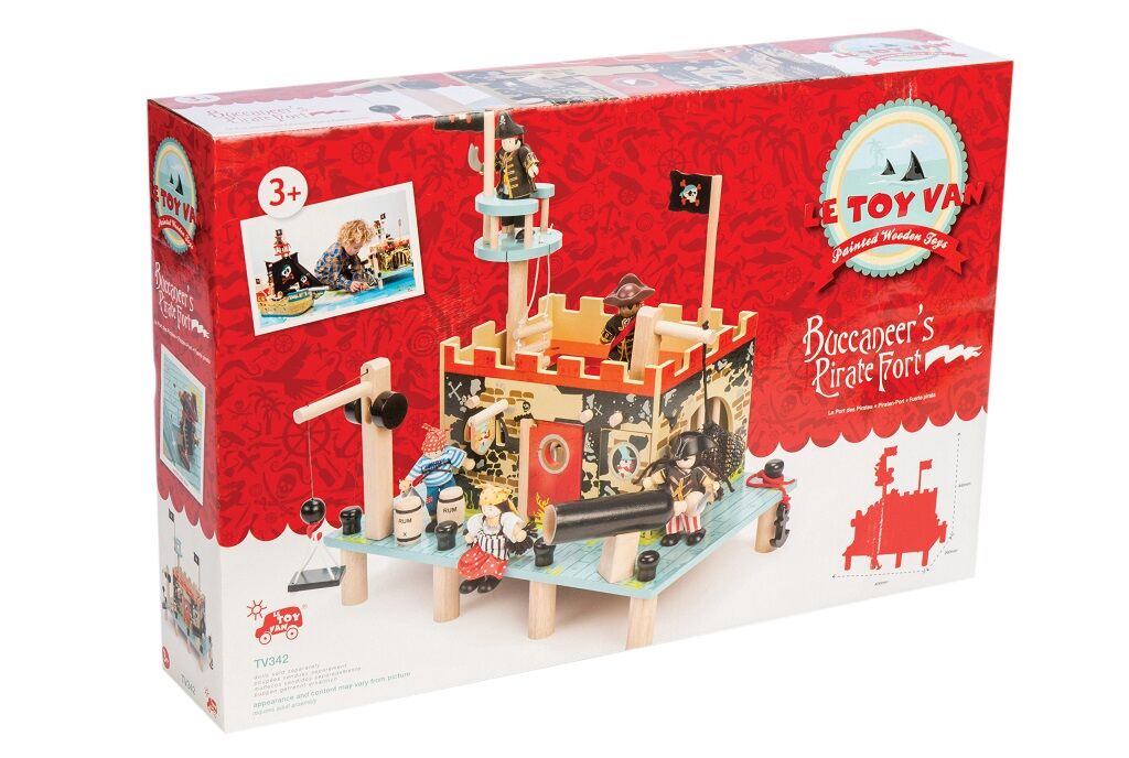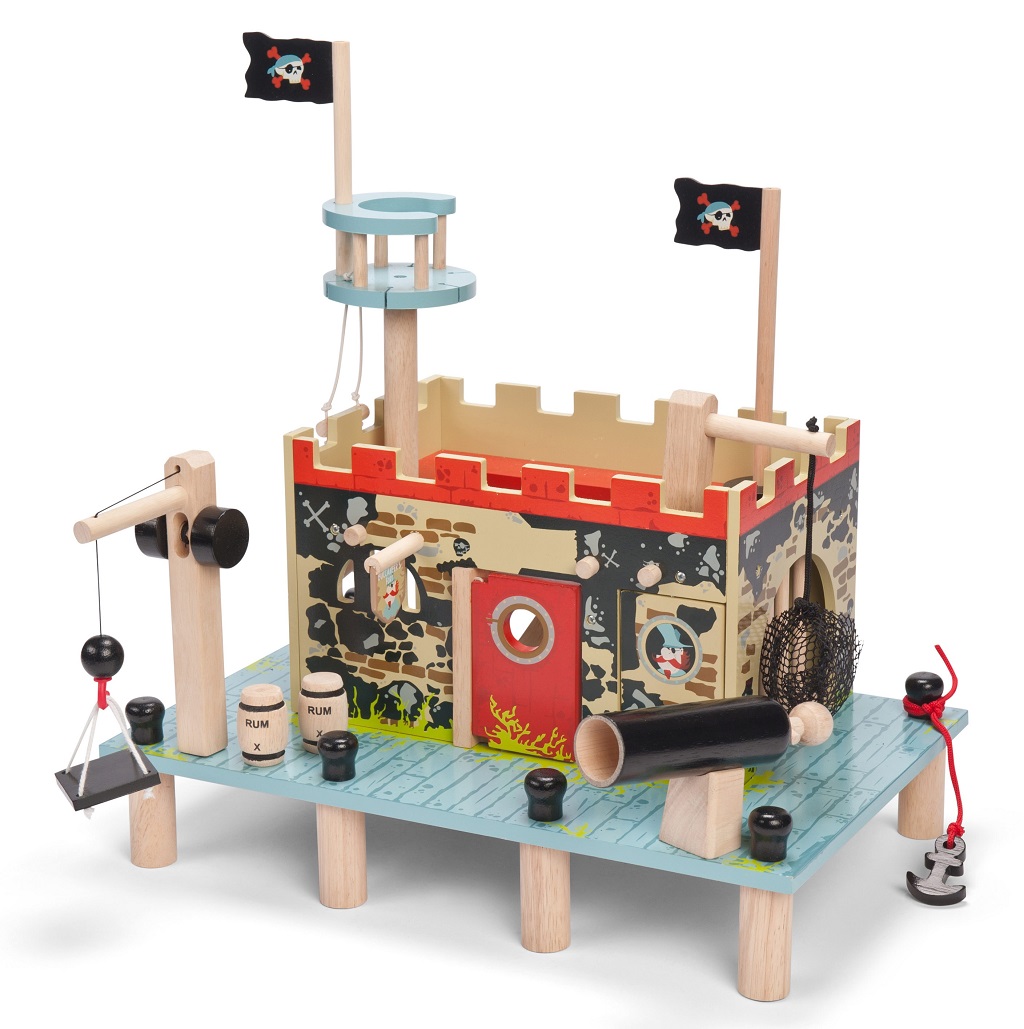 Ručně malovaná plně vybavená pirátská pevnost nabízí úžasná dobrodružství pro naše malé piráty. Obsahuje pirátské vlajky, vraní hnízdo, lanový žebřík, nákladní naviják, kotvu, dveře se sítí, tajné otočné dveře a dělo.