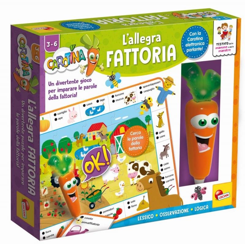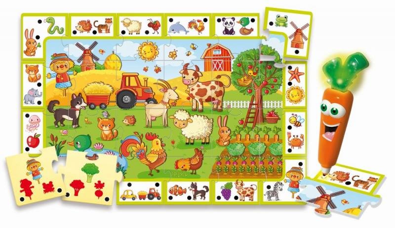 Mluvící a blikající pero Liscianigioch Carotina The Happy Farm nabývá podobu mrkve s roztomilým kukučem a s rozjařeným a velice přívětivým úsměvem, kdy pobaví i mnohé naučí malé předškoláky ve věku od 3 let. Pomocí oboustranných obrázkových puzzlí s krásným malovaným motivem farmy mohou děti rozpoznávat rozličná hospodářská i volně žijící zvířata a nechybí zde také celá řada dalších jednoduchých kvízů pro rozvoj klíčových dovedností, na které bude vaše ratolest odpovídat pomocí pera Carotina. Tento hrací set tak podporuje logické uvažování, paměť, smyslové vnímání a koordinaci rukou a očí, které vaše ratolest zaručeně využije na své cestě životem. O napájení se pak starají 2 baterie LR44, které jsou součástí balení.