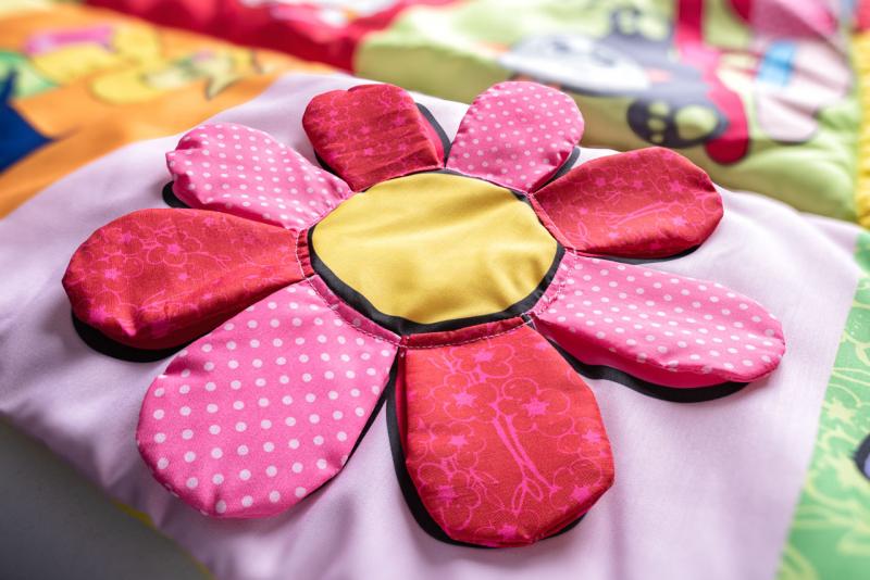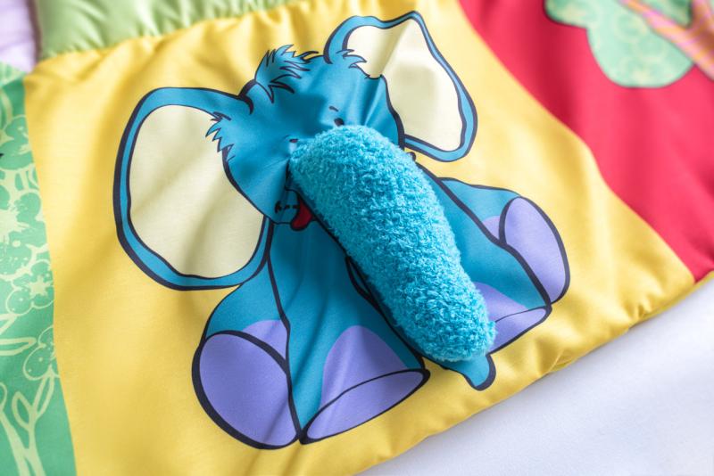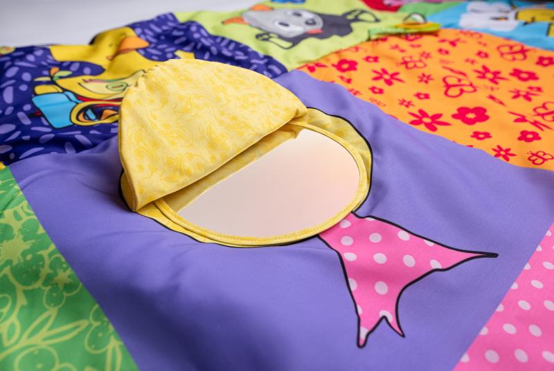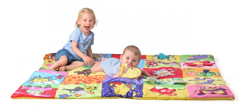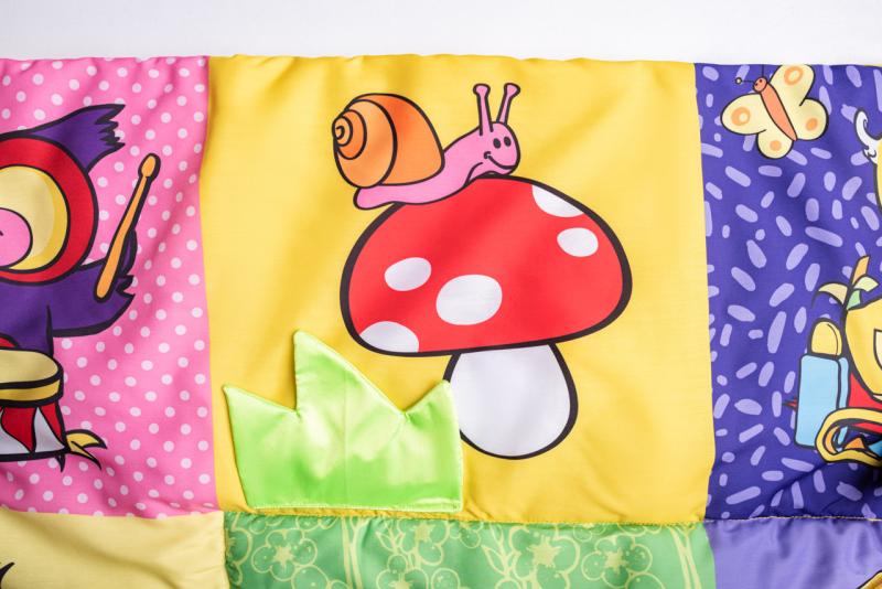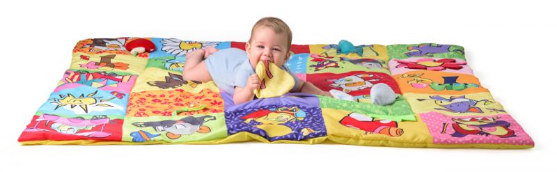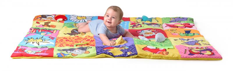 Prostorná hrací deka ve stylu patchwork nabízí mnoho hracích aktivit, které jsou zakomponovány do jednotlivých obrázků. Okvětní lístky, uši pejska, ocásek kočičky i zelený trs travičky vydávají po promnutí zvuk šustícího papíru. Chobot slona a mochomůrka mají zabudované pískátko. Okvětní lístky zeleného chrastítka ve tvaru kytičky jsou zároveň i kousátkem. Když odklopíte korunu žlutého stromu odhalíte bezpečnostní zrcátko, ve kterém dítě uvidí svůj obličej a bude na něj s nadšením reagovat.