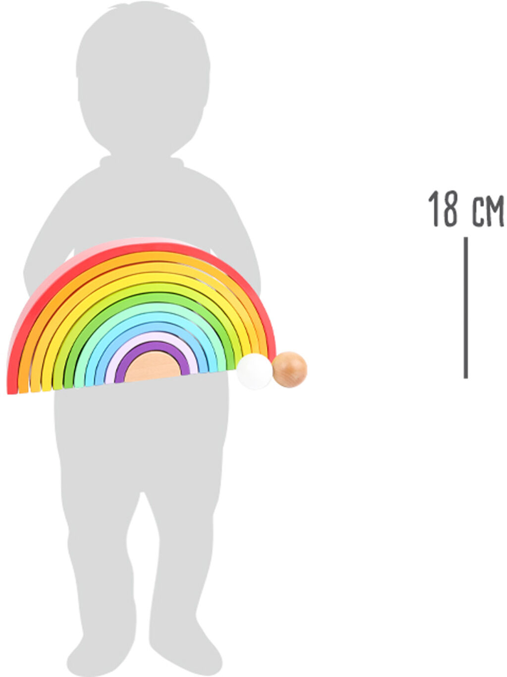 Barevná zábava zaručená. Duha včetně 2 dřevěných kuliček je vyrobená z odolného dřeva v pestrých barvách. Složená duha patří na každou polici v pokojíčku, má mnoho variací skládání a hraní. Z duhy můžete vytvořit také dráhy pro kuličky, vysokou věž nebo houpačku pro plyšáky. Je všestranná a podporuje tvořivost dětí. Která barva je nejkrásnější?