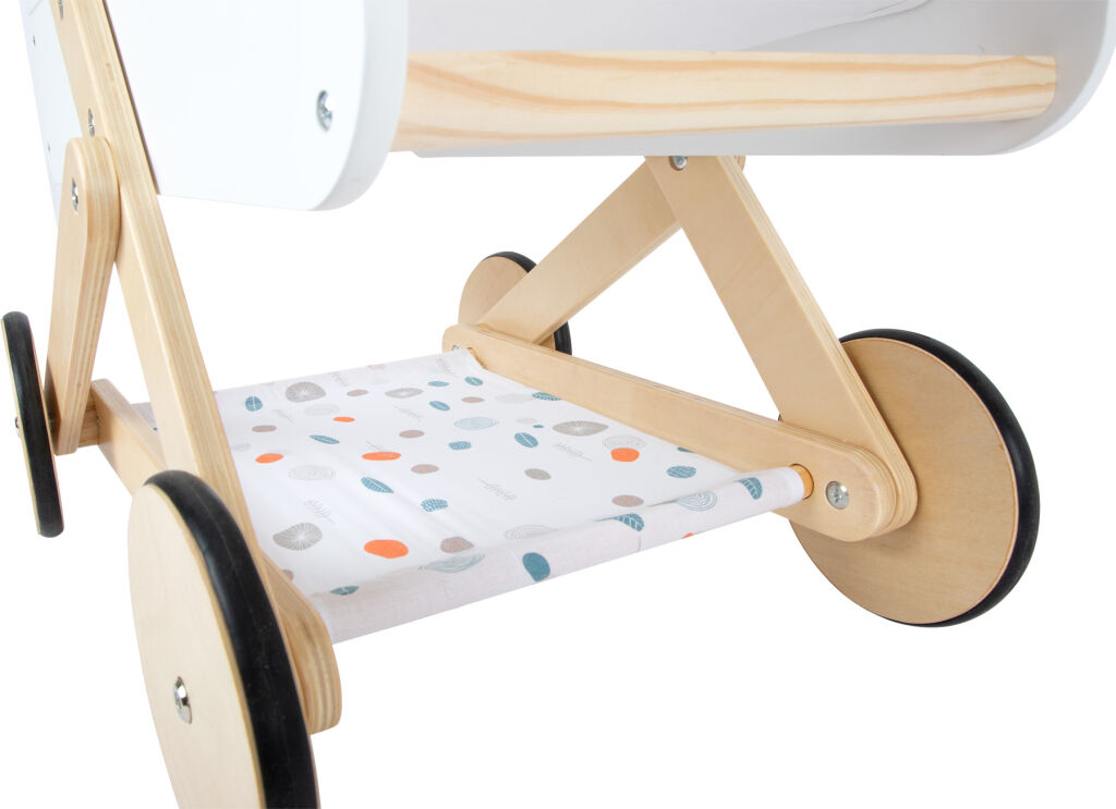 Pro panenky, plyšáky a jejich kamarády jen to nejlepší. Tento moderní kočárek značky Small Foot pro panenky na vás udělá dojem svým jemným, lineárním skandinávským designem a také úložným prostorem pod lehátkem. Díky odklápěcí stříšce mohou panenky a plyšáci z kočárku koukat dopředu nebo dozadu. Oboustranné a genderově neutrální povlečení s peřinou nadměrné velikosti zajistí, že panenky a plyšáci do 46 cm budou v pohodlí. Kočárek má tichá pogumovaná kolečka. Moderní kočár s prvky z přírodního dřeva, s omyvatelným textilem jen čeká kdo se v něm sveze. Je velmi stabilní i při své nízké váze, hodí se do každého pokoje a to díky svému neutrálnímu designu.
