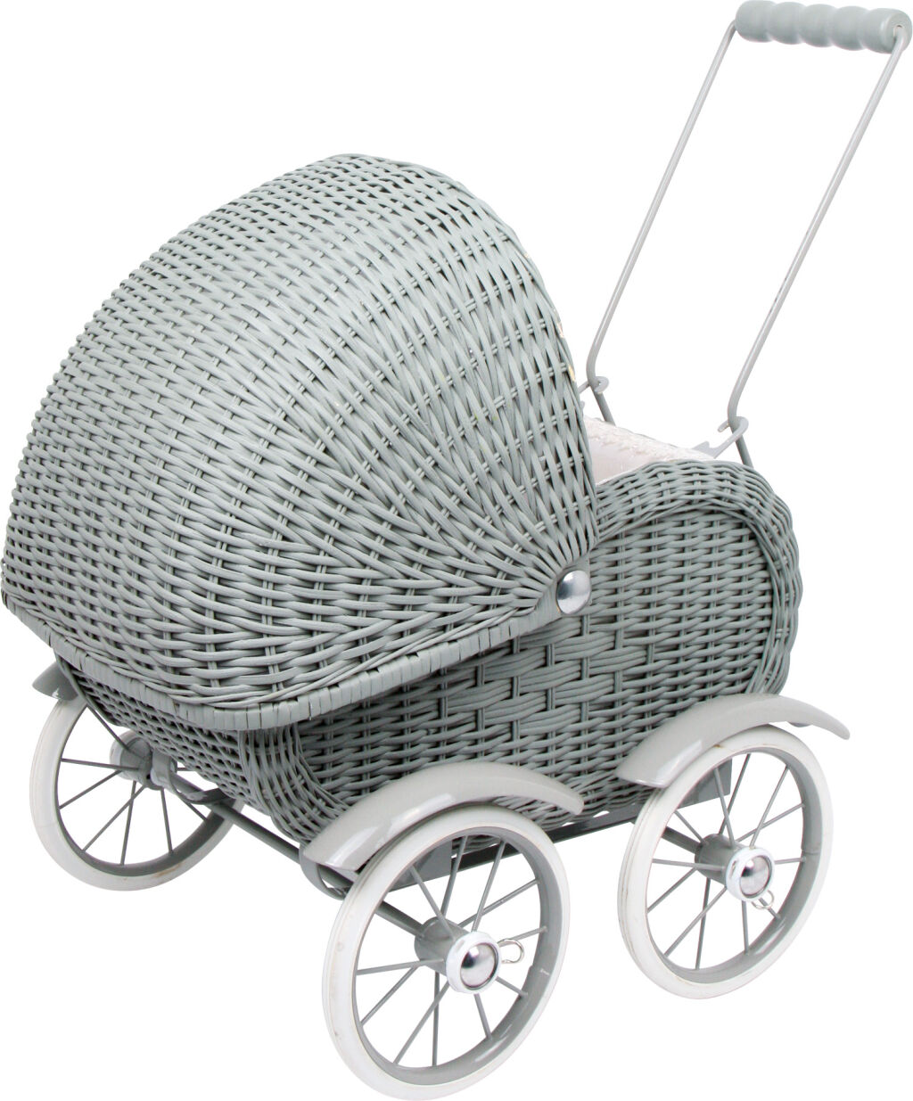 Šedý proutěný kočárek potěší každou holčičku, která se ráda stará o svoje miminko a miluje hru s panenkami. Díky krásnému retro designu můžete kočárek věnovat své malé princezně nebo ho použít jako dekoraci. Součástí kočárku je i peřinka a polštářek pro panenku. Vhodný pro děti od 3 let. Kočárek má kovový rám, blatníky a gumová kolečka, která zajišťují tichý chod. Tradiční design a přírodní materiály dělají z kočárku hračku, kterou si budete chtít schovat ještě pro svoji vnučku.