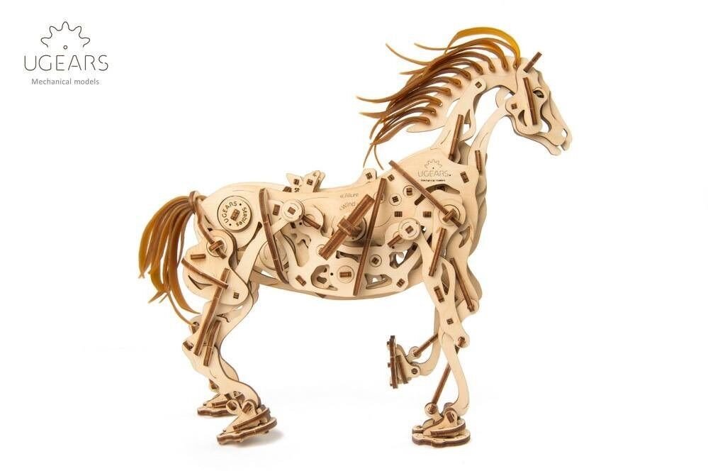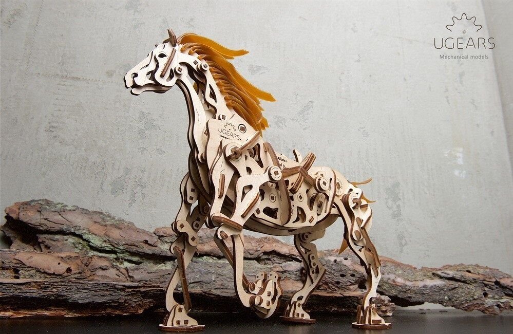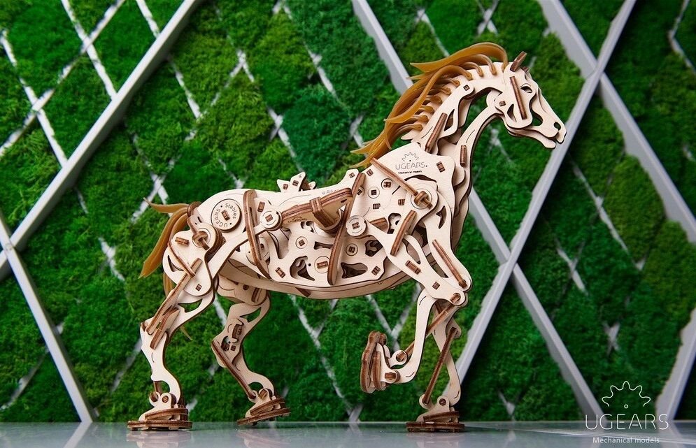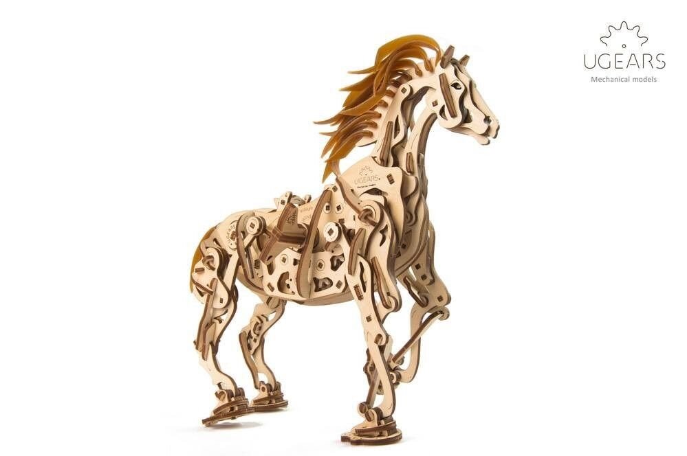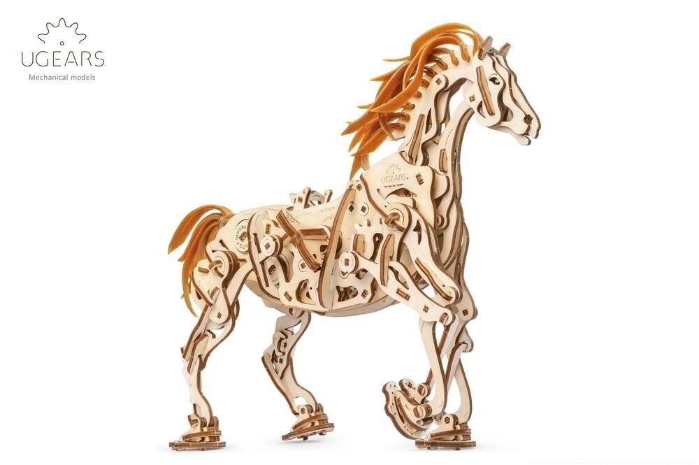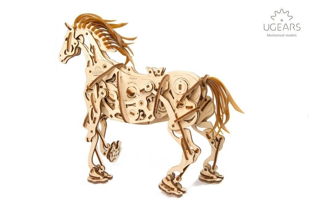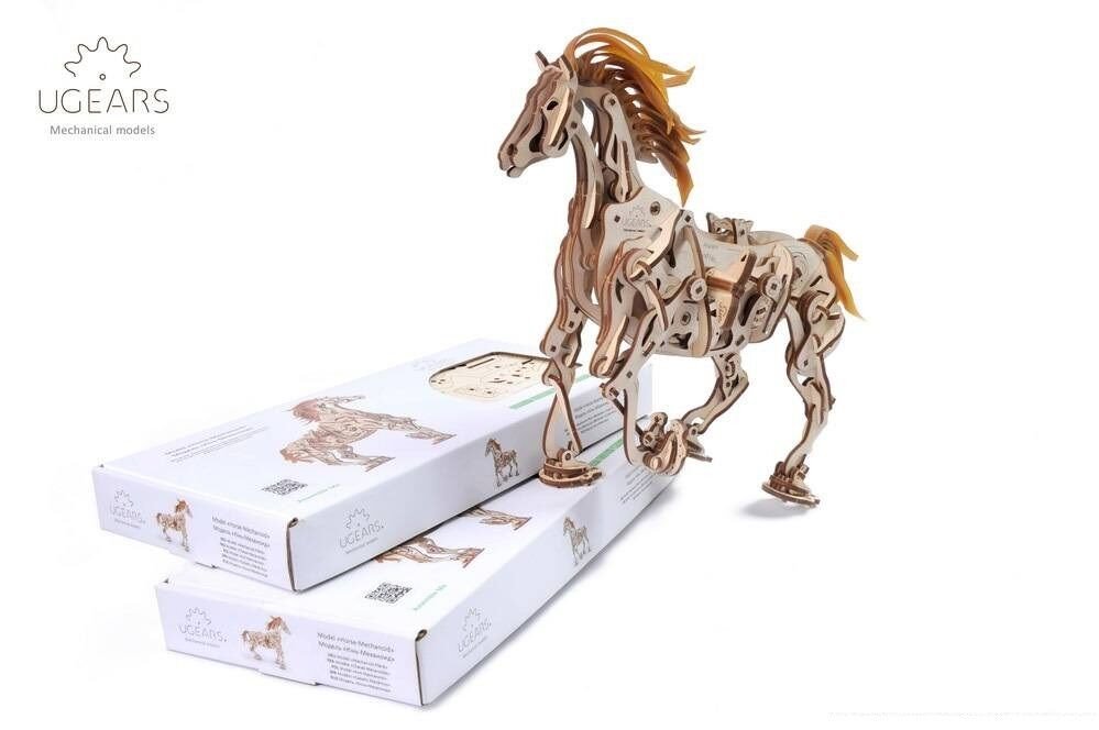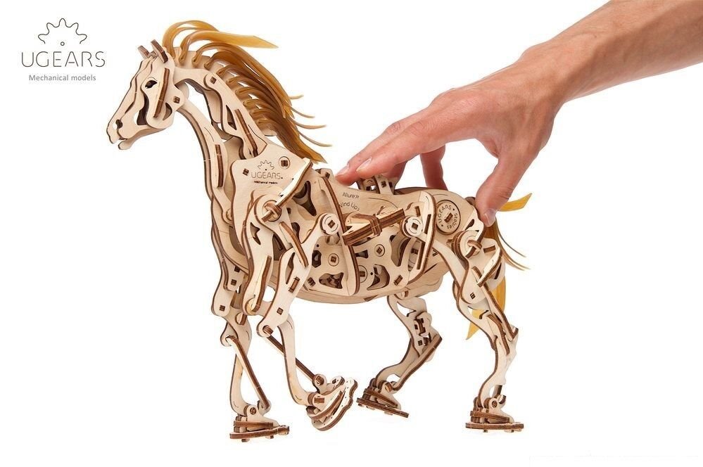 Model napodobuje skutečné pohyby koně díky jedinečnému mechanismu, který se u stavebnic společnosti UGears objevil poprvé. Všechny klouby a anatomie koně připomínají a fungují podobně jako u živého zvířete. Drápový mechanismus napomáhá pohybu nohou. V hrudníku najdete bionické srdce v podobě kyvadla. Jeho kmitání zpomaluje přenos energie z gumového páskového motoru na ostatní prvky. Zařízení díky němu pracuje delší dobu. I když koník neujde velkou vzdálenost, pohled na práci mechaniky vás potěší. Hříva a ocas jsou vyrobené z pružných gumových pásků. Jakmile tedy kůň zavrtí hlavou, gumová hříva se chvěje.