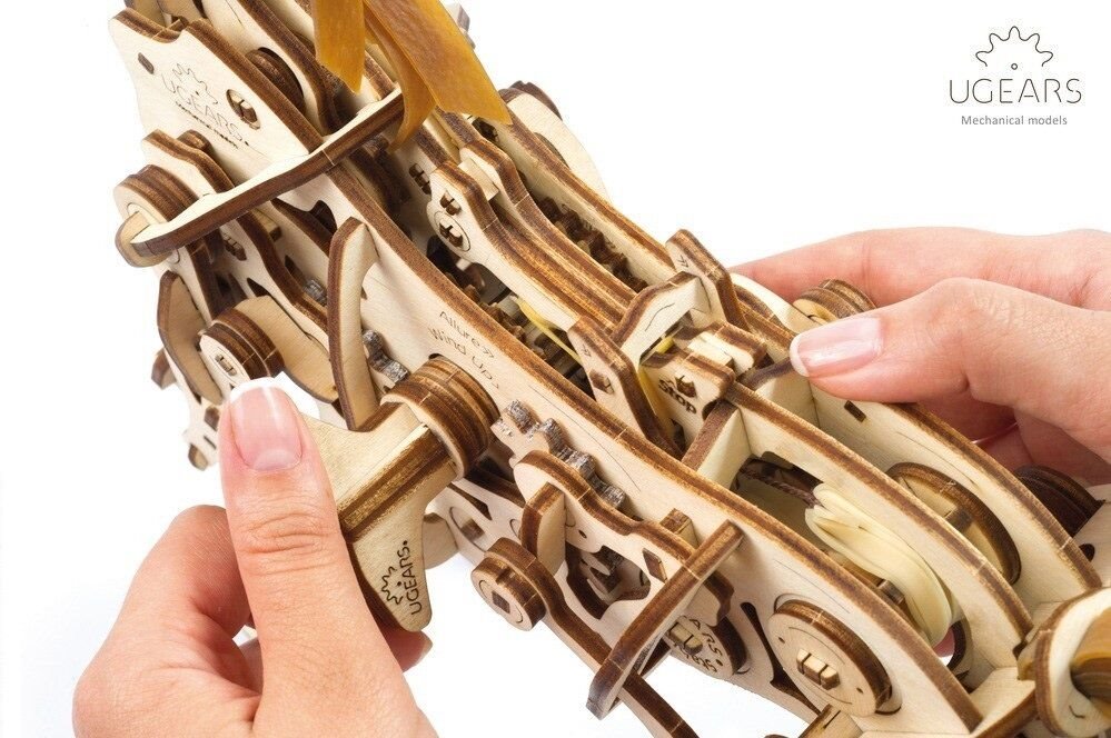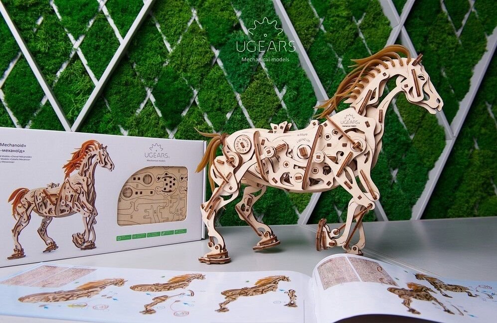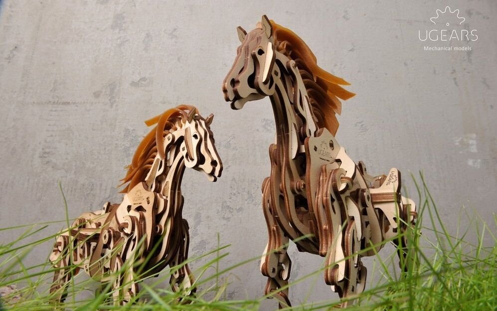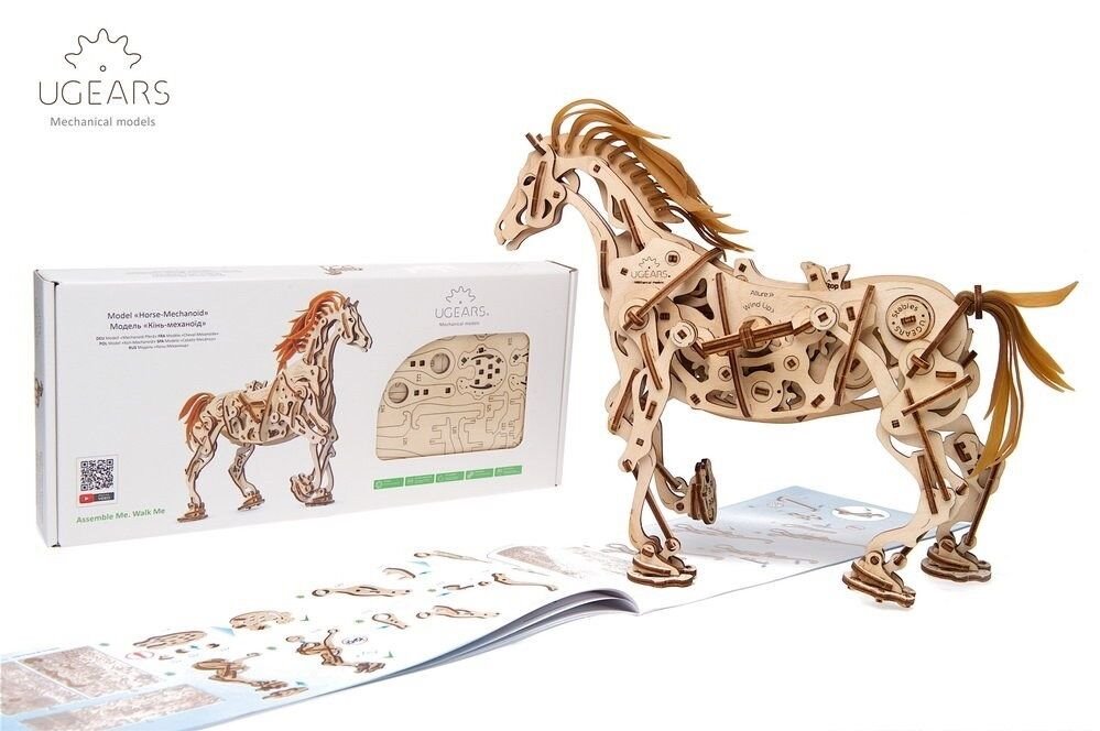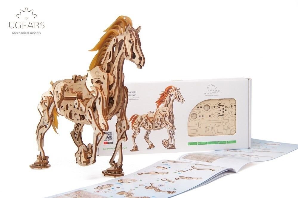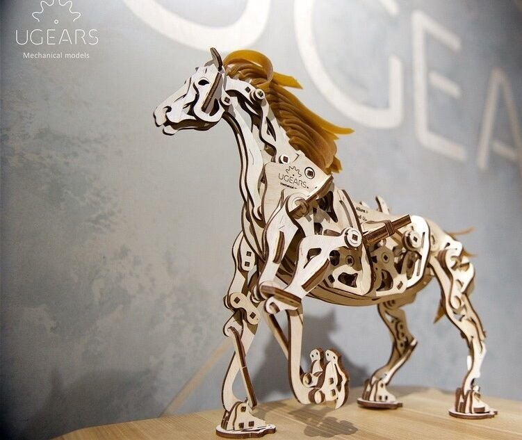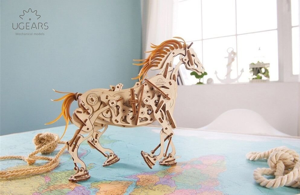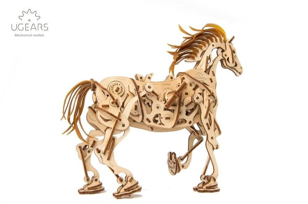 Model napodobuje skutečné pohyby koně díky jedinečnému mechanismu, který se u stavebnic společnosti UGears objevil poprvé. Všechny klouby a anatomie koně připomínají a fungují podobně jako u živého zvířete. Drápový mechanismus napomáhá pohybu nohou. V hrudníku najdete bionické srdce v podobě kyvadla. Jeho kmitání zpomaluje přenos energie z gumového páskového motoru na ostatní prvky. Zařízení díky němu pracuje delší dobu. I když koník neujde velkou vzdálenost, pohled na práci mechaniky vás potěší. Hříva a ocas jsou vyrobené z pružných gumových pásků. Jakmile tedy kůň zavrtí hlavou, gumová hříva se chvěje.