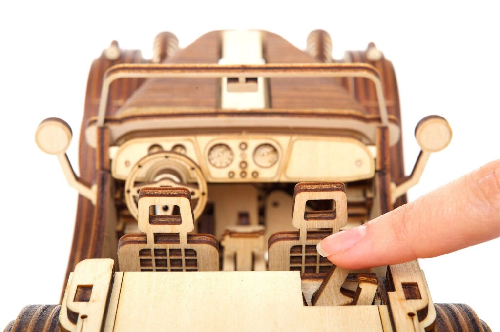 Milovníkům rychlosti a starých časů – stavebnice autoveteránu typu roadster je vyrobená z překližky. Model má otevírací dveře a odklopnou kapotu. Mechanika je do detailu propracovaná, a vy tak můžete pozorovat pohyb pístů motoru. Vůz je řiditelný a díky natahovacímu mechanismu je schopen jízdy, na jedno natažení urazí až 4 m. Má také funkční převodovku pro volnoběh a zpátečku. Uspořádejte závody s dalšími modely UGEARS! Vybaveno detailním návodem k sestavení.