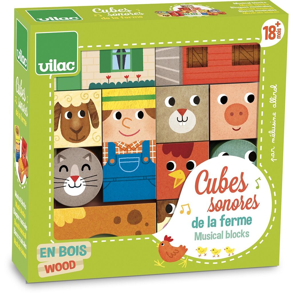 Jedenáct dřevěných zvukových kostek s motivem farmy. S těmito kostkami si děti procvičí motoriku i zručnost a zároveň budou objevovat zvuky. Pro děti velmi poutavá hračka.
