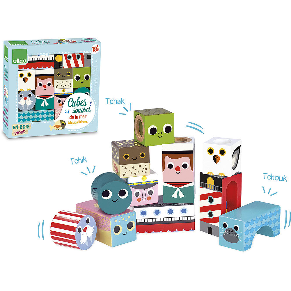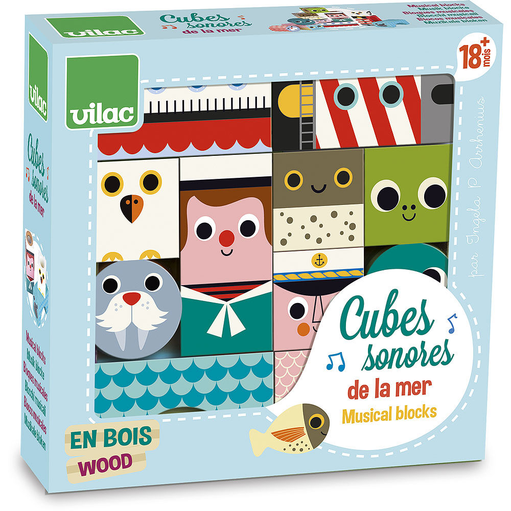 Jedenáct dřevěných zvukových kostek s motivem moře. S těmito kostkami si děti procvičí motoriku i zručnost a zároveň budou objevovat zvuky. Pro děti velmi poutavá hračka. Ilustrováno Ingelou P. Arrhenius. Hračky Vilac mají značku francouzské agentury ADEME, to znamená, že tyto dřevěné hračky jsou vyráběny ekologicky. Šetří životní prostředí, neznečišťují půdu, vodu a vzduch, neplýtvají energiemi.