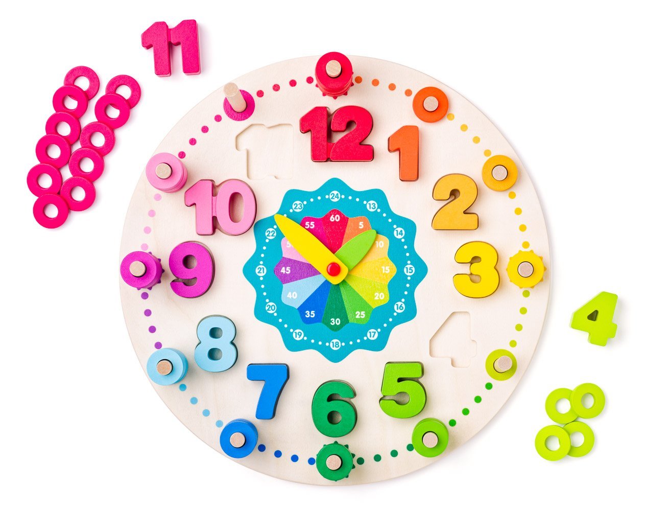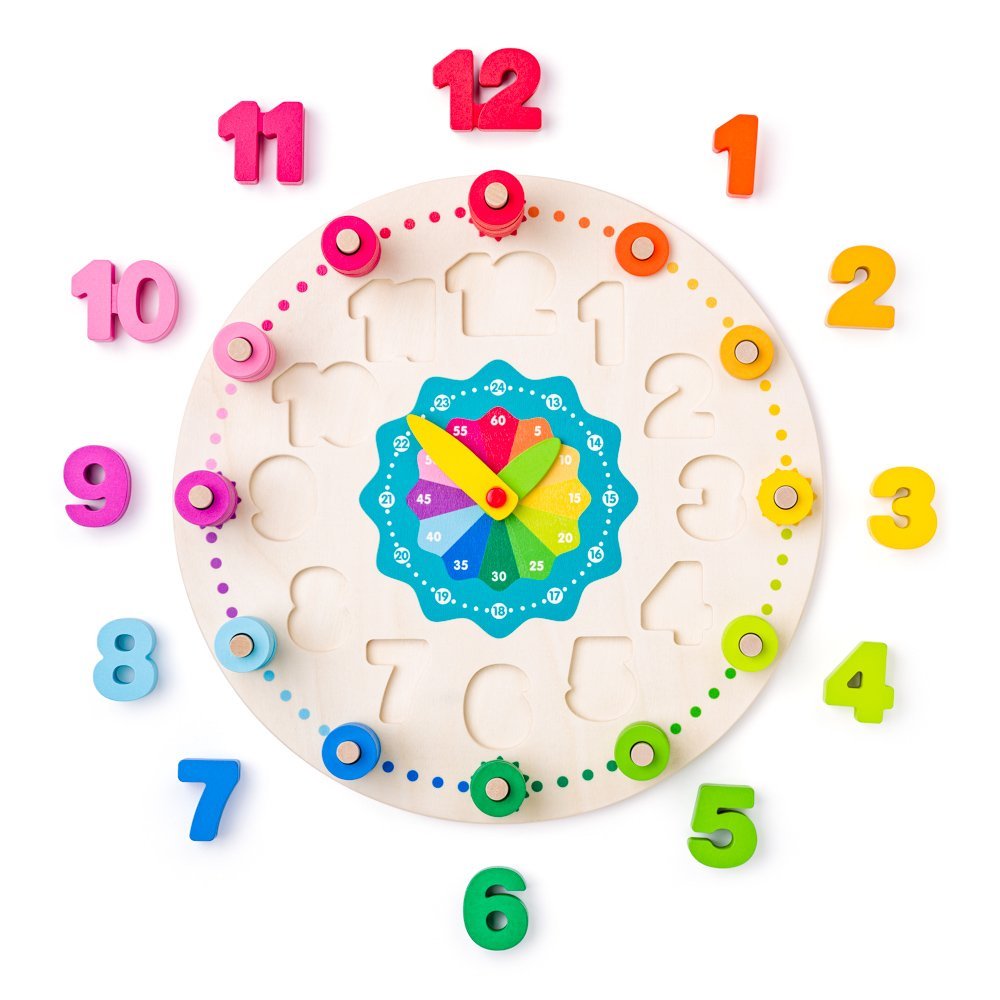 Dřevěné didaktické hodiny Woody s analogovými ručičkami jsou vhodné pro děti od 3 let, kdy představují parádní pomůcku pro učení hodin a určení přesného času. Vizuální zobrazení ciferníku hodin velice usnadňuje porozumění této problematiky, kdy posouváním hodinových ručiček mohou malý šikulové jasně pozorovat plynutí času a snadno tak pochopit celý jeho koncept. Zároveň se naučí poznávat arabské číslice a díky barevným navlékajícím kroužkům i hodnotu, kterou představují. Díky tomu si vaše ratolest snáze zapamatuje konkrétní číslici a brzy tak začne chápat i přesně určit aktuální čas.