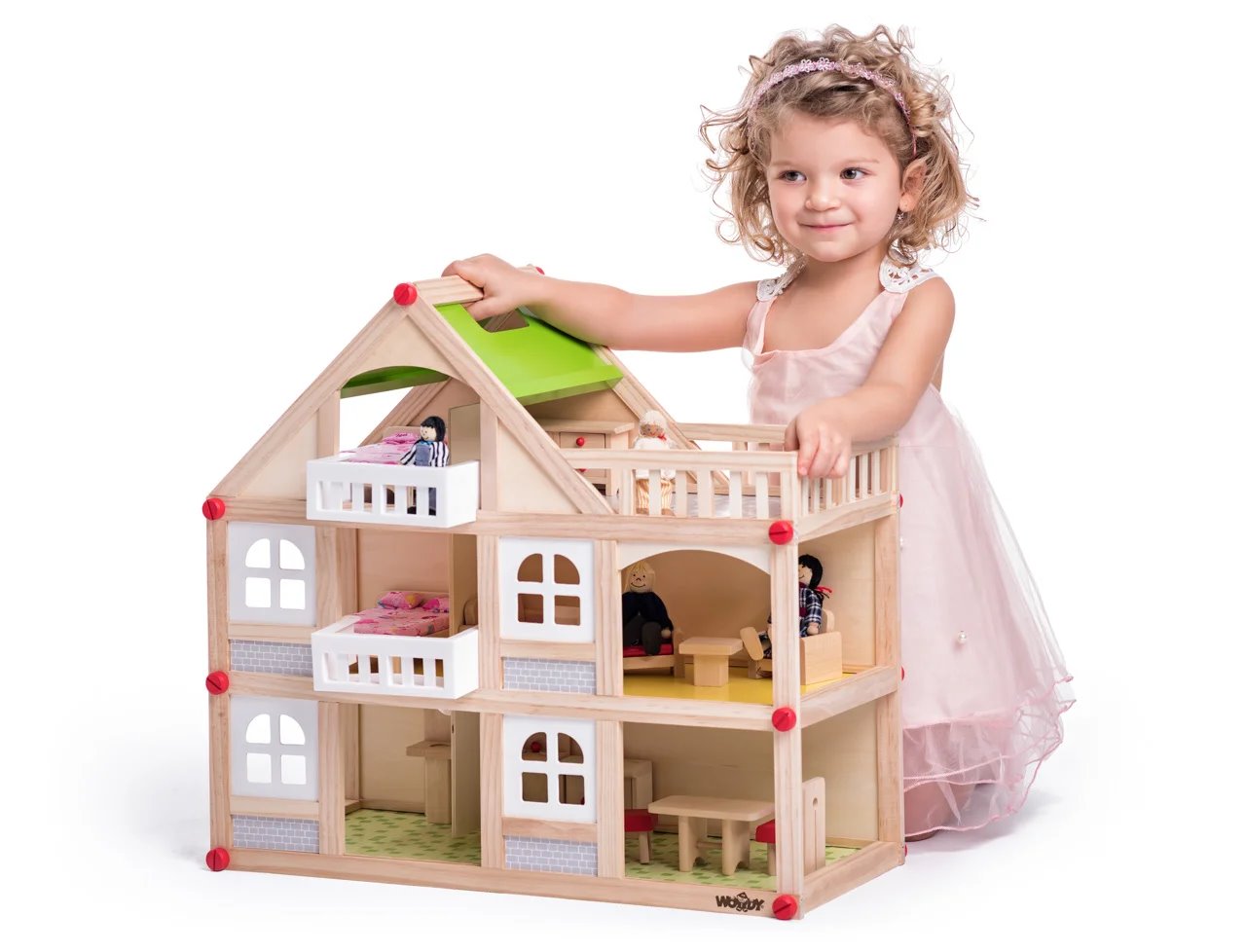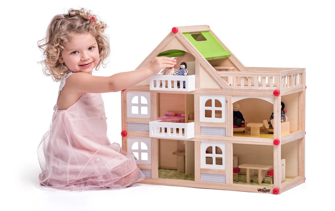 Nádherný domeček pro panenky od značky Woody nadchne každou malou holčičku. Uvnitř se nachází přízemí a 2 patra s místnostmi, které si váš potomek vybaví podle svého. Součástí balení je totiž i nábytek, jako je sedací souprava, stolek a židle do jídelny, skříňka, postel a spoustu dalších věcí. Dítě ho rozmístí do jednotlivých pokojů podle svých představ. Kromě vybavení dostane k domečku i 4 panenky.