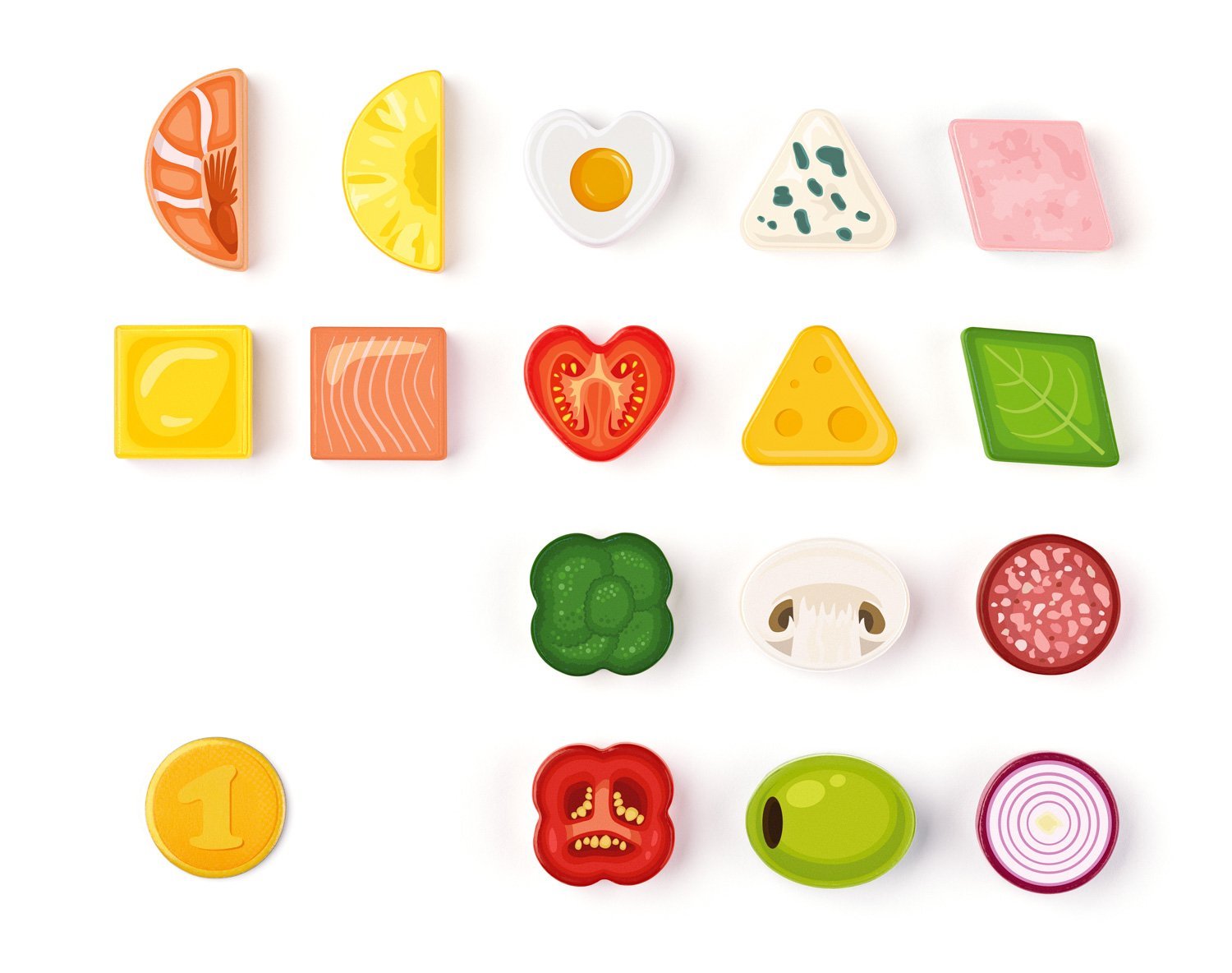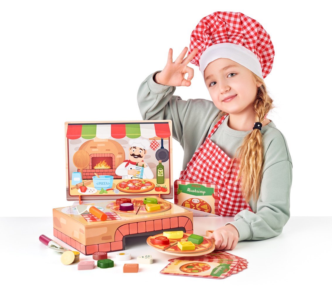Didaktická hra značky Woody je především o rozlišování tvarů. Naučná část je příjemně propojená s přípravou a "pojídáním" pizzy. Dítě má za úkol připravit pizzu dle obrázku vybrané karty za pomocí dílků s ingrediencemi. Dílky však musí přesně sedět. Tvarem i obsahem musí odpovídat vybrané kartě. Hotovou pizzu pak vloží do pece, upeče a pak už jen zbývá vyinkasovat přesný počet mincí, který je uvedený na každé kartě.