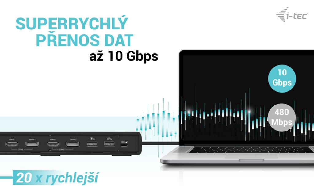 USB Gen 2. Dokovací stanice podporuje výstup až na dva externí