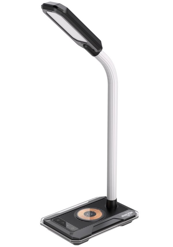 Praktická stolní lampička s pokročilou LED technologií, ohebným ramenem a moderním designem. Nastavení intenzity osvětlení i barevné teploty probíhá pomocí dotykového tlačítka. Nabízí RGB podsvícení se 4 volitelnými světelnými módy a možnost RGB reagovat na zvuky pomáhá vytvořit příjemný světelný podtón v místnosti a zároveň skvěle doplňuje celkový vzhled lampičky. Dále je k dispozici bezdrátová nabíječka standardu Qi s výkonem 10 W a nabíjecí USB port. Mobilní telefon s podporou bezdrátového nabíjení se začne nabíjet při pouhém položení na nabíjecí plochu.