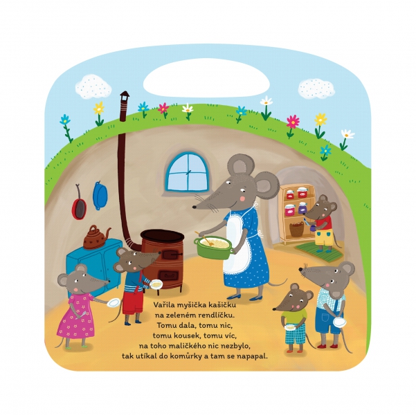 Knížka obsahuje tyto říkanky: Sedí liška pod dubem; Šel Janeček na kopeček; Vařila myšička kašičku; Myšičko, myš; Paci, paci, pacičky; Jedna, dvě, tři, čtyři, pět; Naše kočka strakatá; Á, bé, cé, dé, kočka přede; V komoře je myš; Pekař peče housky; Houpy, houpy; Foukej, foukej větříčku.