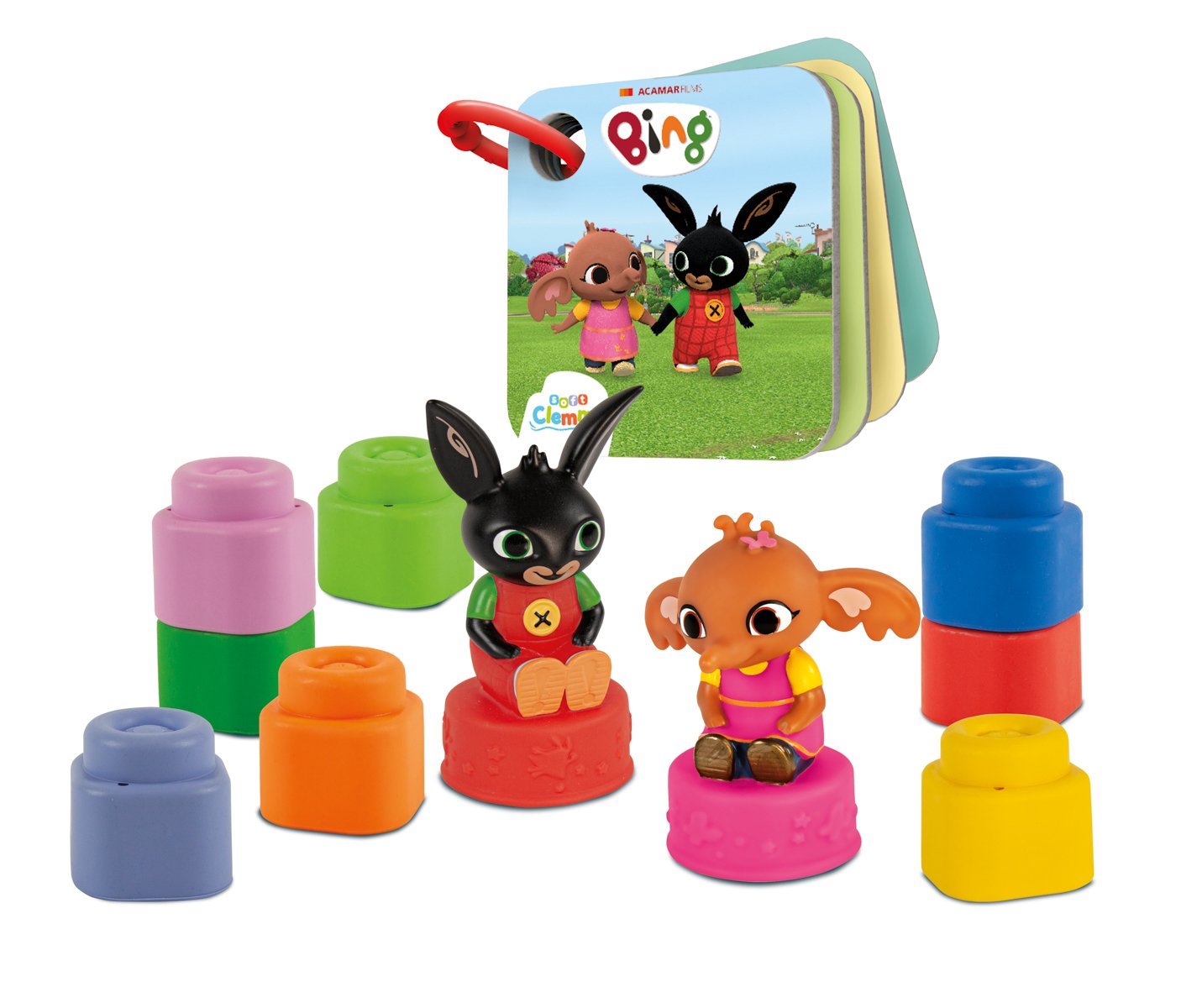 Pomozte svému děťátku s rozvojem smyslových vjemů, manuální zručnosti a motorické koordinace. Kostky s knížkou Bing! od značky Clementoni obsahuje spoustu měkkých kostek (kamenů), se kterými se vaše dítě zabaví. Poskládá jednotlivé díly na sebe a vytvoří věž. Zároveň se s nimi můžete učit názvy barev bloků. V knížce jsou navíc ilustrované příběhy a dobrodružství králíčka Binga a jeho kamarádky Suly. Obě postavičky se nachází v balení.