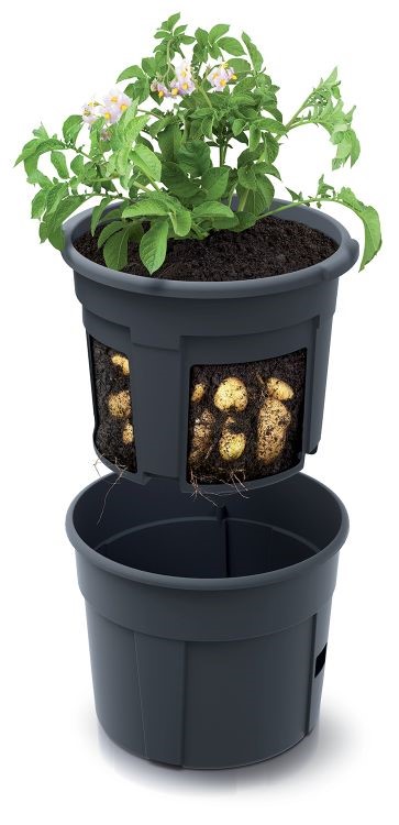 Do květináče nasypete hlínu a zasadíte brambory. Vklad s otvory se postará o kvalitní zavlažování rostliny. Speciální konstrukce vám zajistí pohodlné pěstování této oblíbené plodiny.
