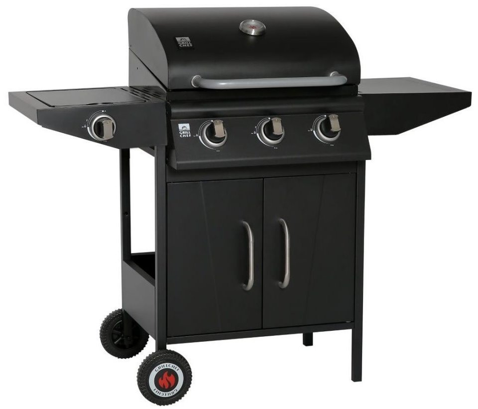 Plynový gril je vybaven dvoudílným litinovým roštem, odklápěcím krytem grilovací plochy a odkládací poličkou. K dispozici je jeden boční a tři hlavní nerezové hořáky s integrovaným zapalováním a plynovou regulací. Veškerý přebytečný tuk se shromažďuje do integrované odkapávací misky.