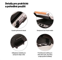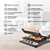 Plotýnky grilu mají nastavitelnou polohu. Můžete například upravit výšku a sklon plotýnky tak, aby se snížil tlak působící na křehké suroviny, jako jsou třeba čerstvé ryby. V BBQ módu si u každé z plotýnek můžete nastavit požadovanou teplotu ohřevu separátně. Se správnou volbou teploty pro jednotlivé druhy potravin vám pomůže přiložený průvodce. Zároveň si pro každý pokrm můžete nastavit požadovaný čas přípravy, takže se nemusíte bát, že netrefíte správný stupeň propečení. Gril je vybaven i funkcí automatického vypnutí, díky vysokému výkonu se velmi rychle rozehřeje a o průběhu přípravy máte přehled díky LED displeji. V nabídce jsou i ploché plotýnky pro ještě širší možnosti grilu.
