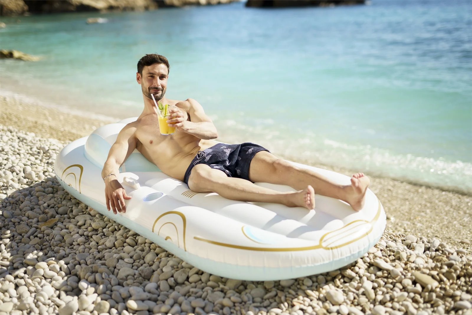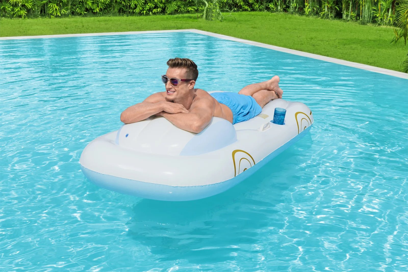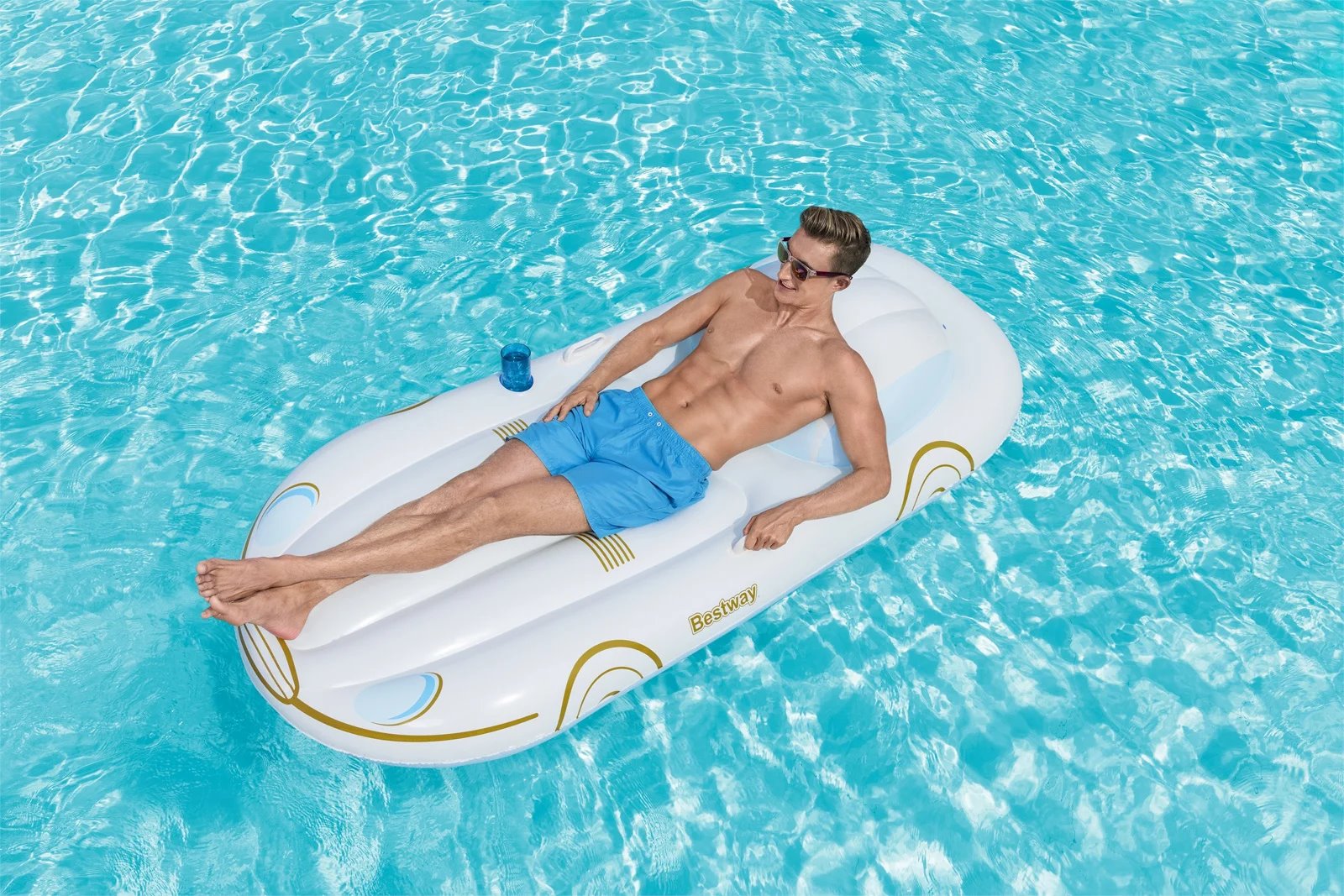 Nafukovací lehátko Bestway v designu prázdninového křižníku se stane příjemným společníkem při lenošení, relaxaci nebo při opalování na letní dovolené u vody, u moře, na pláži i u vás doma na zahradě. Nafukovací lehátko je vyrobené z velmi odolného vinylu se dvěma pevnými madly. Kruh má navíc i pohodlnou opěrku / polštářem a praktický držák na nápoj. Odpočiňte si na hladině vody a nechte se unášet šplouchajícími vlnkami!